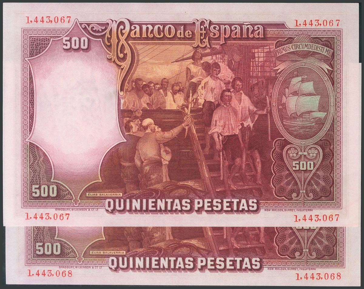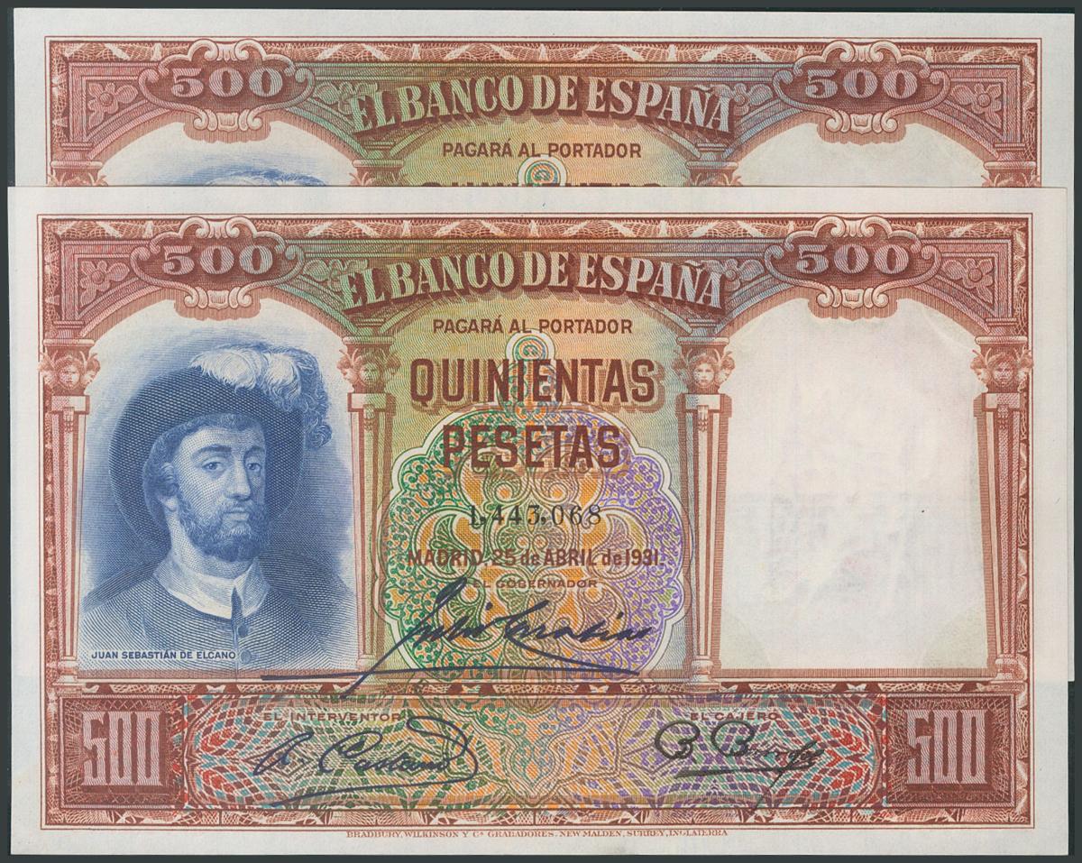 500 Pesetas. 25 de Abril de 1931. Pareja correlativa. Sin serie. (Edifil 2017: 361). Apresto original. SC-.