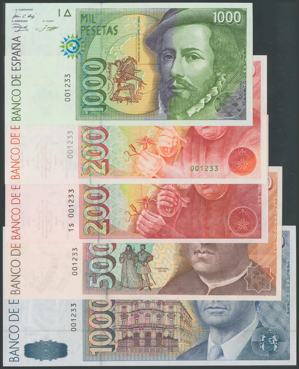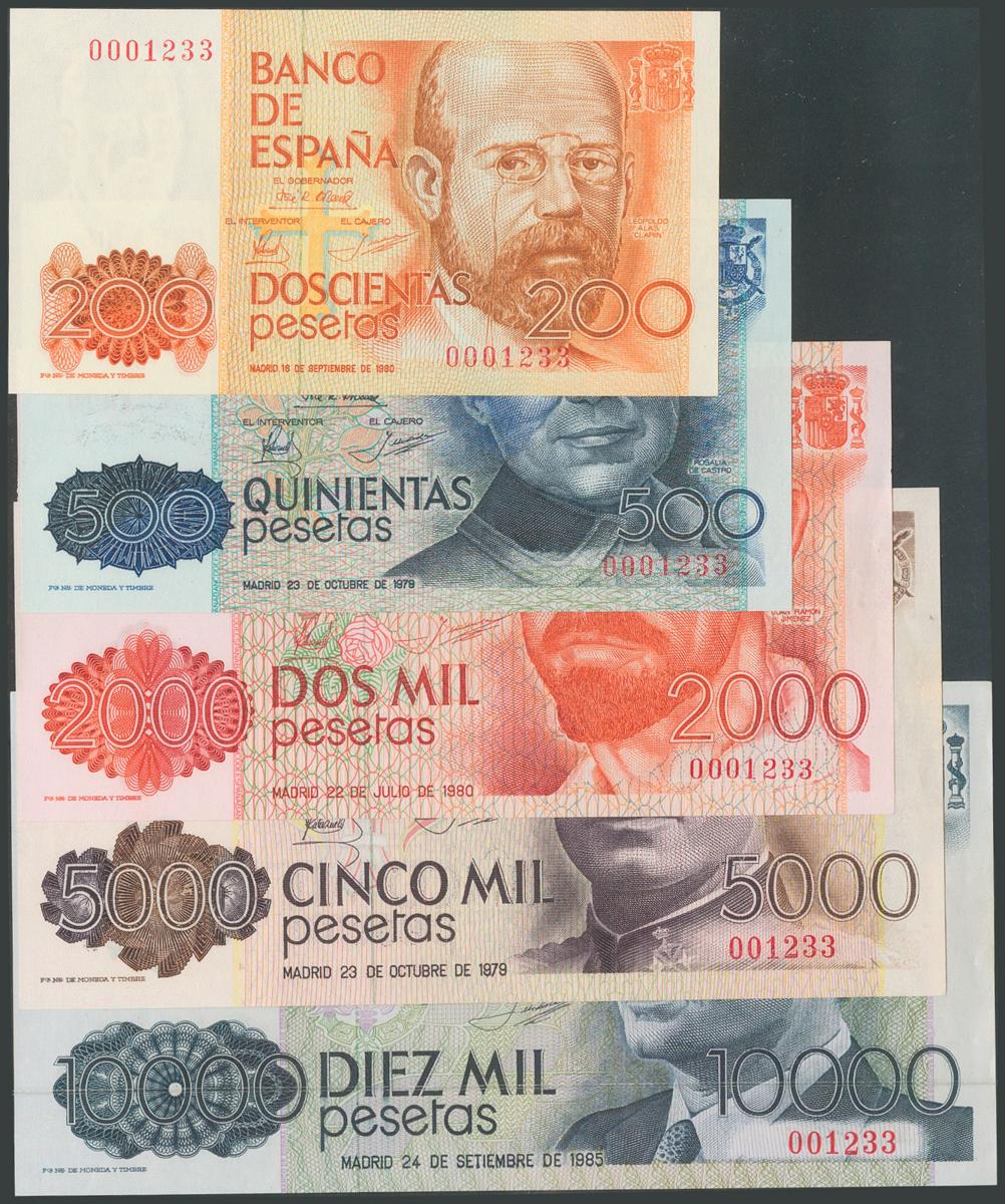 Conjunto de 5 billetes de 200 Pesetas, 500 Pesetas, 2000 Pesetas, 5000 Pesetas y 10000 Pesetas, todos los billetes emitidos entre 1979 y 1985 (a excepción del 1000 Pesetas), todos sin serie y con la misma baja numeración 001233, además la serie completa de 5 billetes de la emisión de 1992 (incluyendo el de 2000 Pesetas de 1995 con la serie 1S), todos sin serie y con la misma numeración baja que el grupo anterior 001233. (Edifil 2017: 476, 478/81, 482/85, 482A). Rarísimo conjunto. SC.