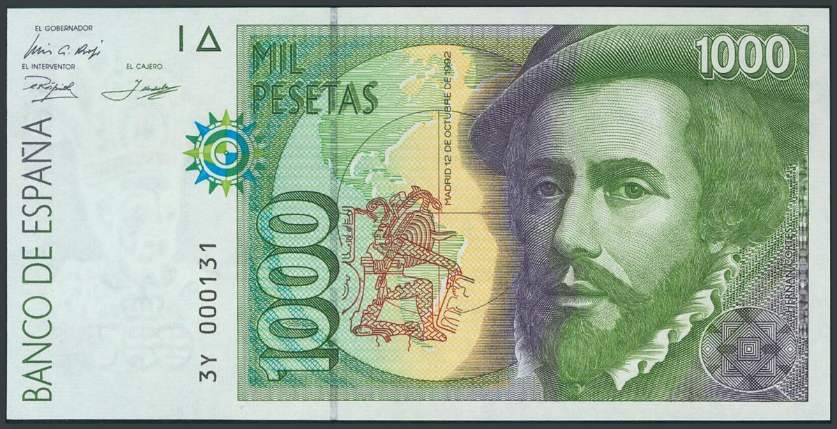 1000 Pesetas. 12 de Octubre de 1992. Tipo II. Serie 3Y y numeración baja y capicúa imperfecto. (Edifil 2017: 483b). SC.