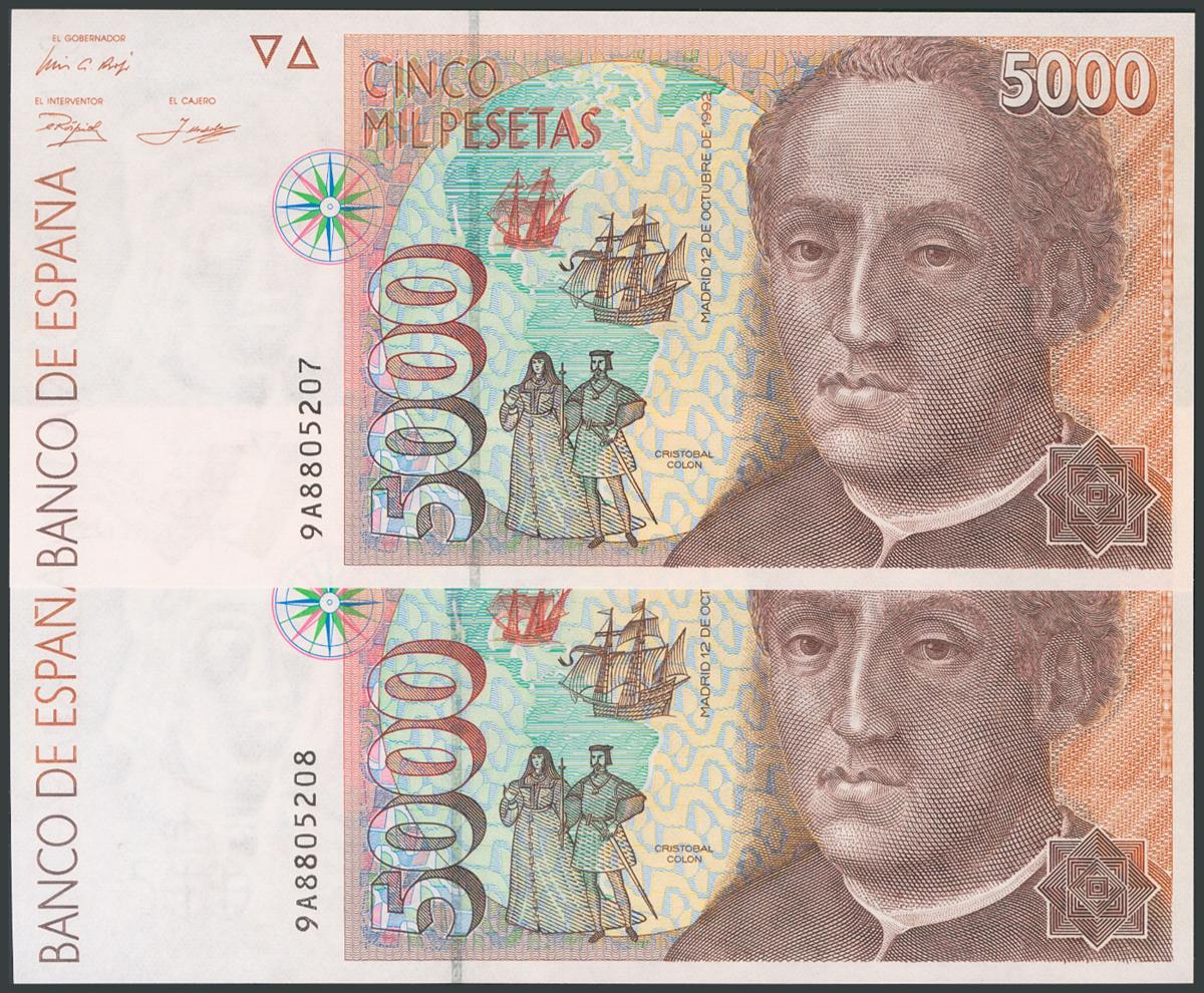5000 Pesetas. 12 de Octubre de 1992. Pareja correlativa. Serie 9A, numeración especial. (Edifil 2017: 484c). SC.