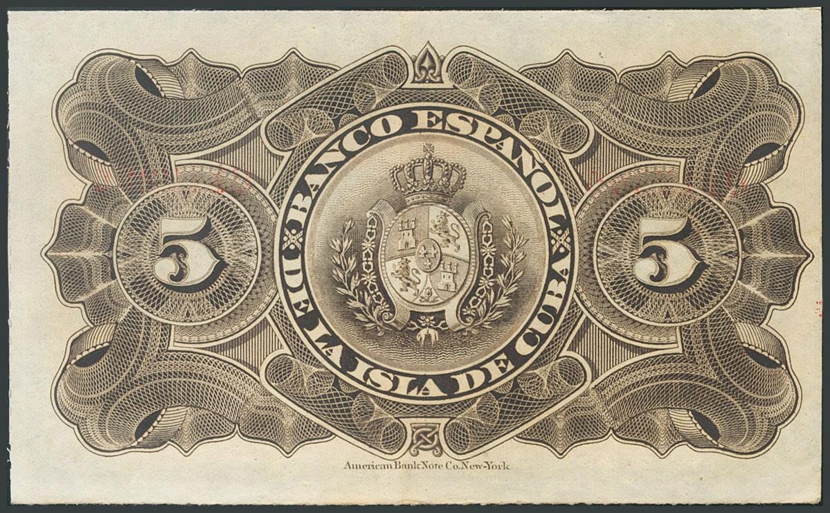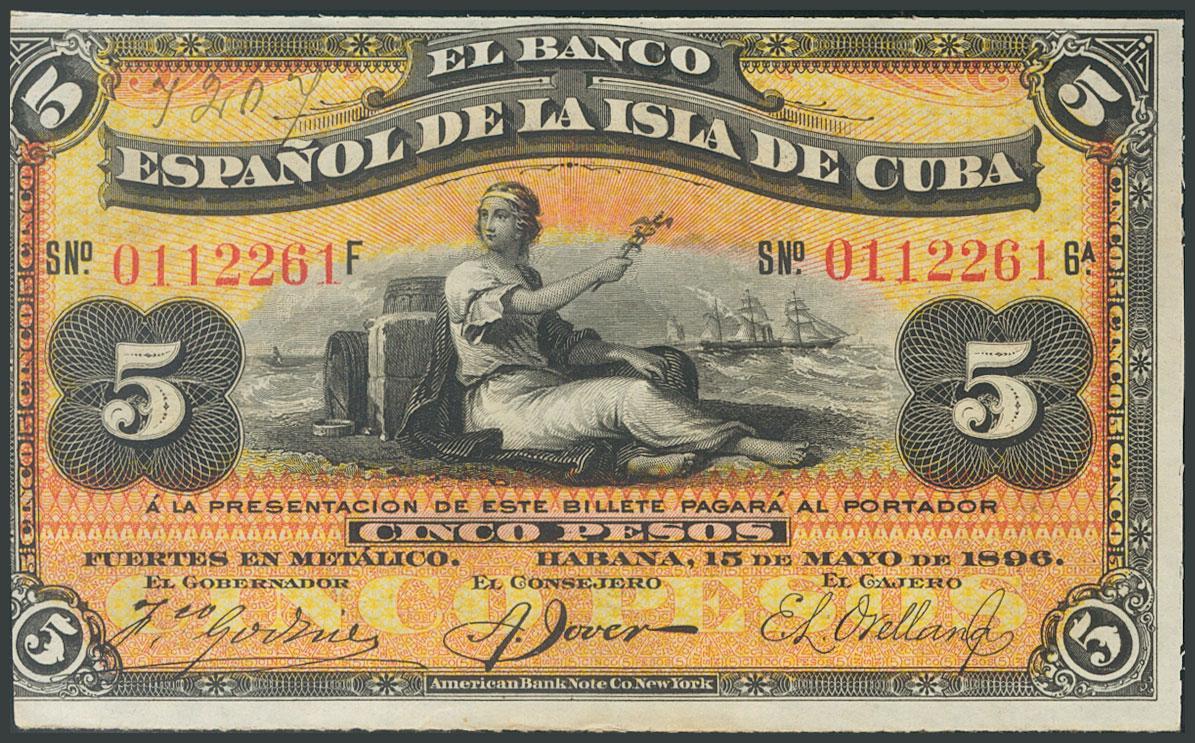 BANCO ESPAÑOL DE LA ISLA DE CUBA. 5 Pesos. 15 de Mayo de 1896. Serie F. (Edifil 2017: 72). Presenta parte del apresto original. EBC.