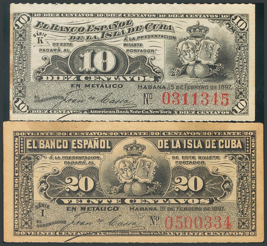 BANCO ESPAÑOL DE LA ISLA DE CUBA. 10 Centavos y 20 Centavos. 15 de Febrero de 1897. Series K e I, respectivamente. (Edifil 2017: 84, 85). EBC.