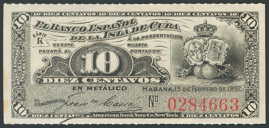 BANCO ESPAÑOL DE LA ISLA DE CUBA. 10 Centavos. 15 de Febrero de 1897. Serie K. (Edifil 2017: 84). Apresto original. SC-.