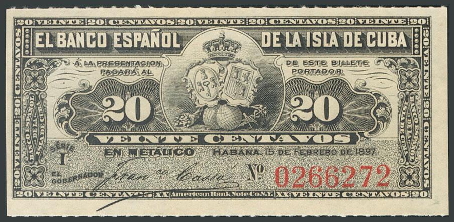 BANCO ESPAÑOL DE LA ISLA DE CUBA. 20 Centavos. 15 de Febrero de 1897. Serie I. (Edifil 2017: 85). Apresto original. SC.