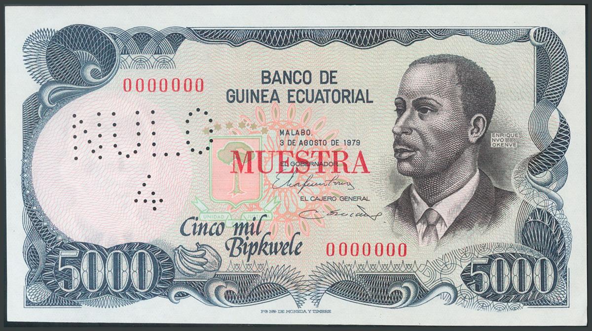 GUINEA ECUATORIAL. 5000 Bipkwele. 3 de Agosto de 1979. MUESTRA y numeración 0000000. (Pick: 17). Rarísimo y apresto original. SC.