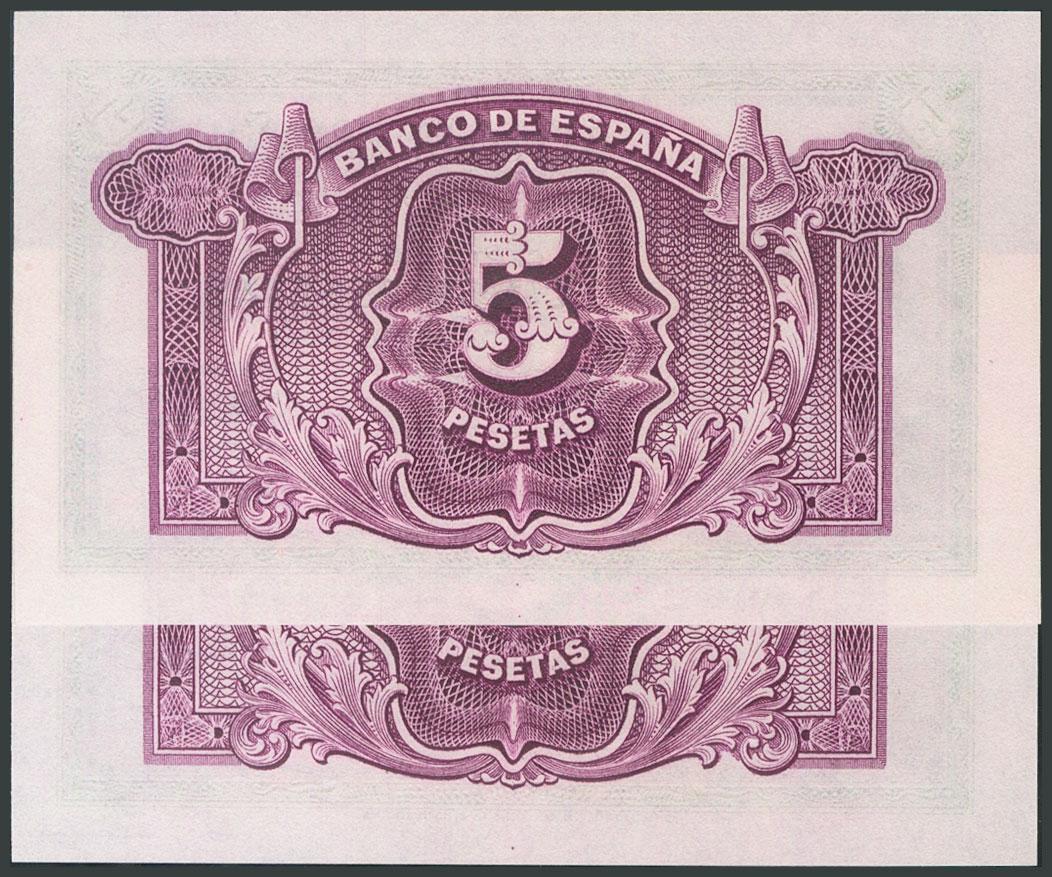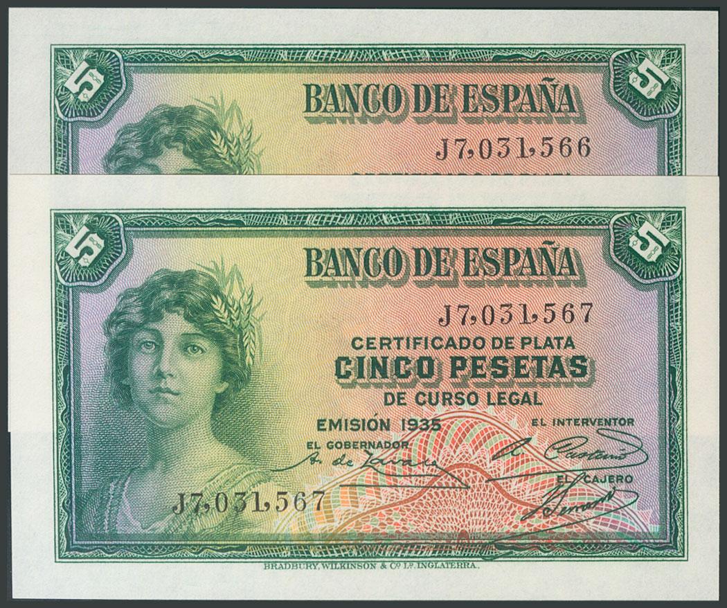 5 Pesetas. 1935. Pareja correlativa. Serie J. (Edifil 2017: 363b). Apresto original. SC.