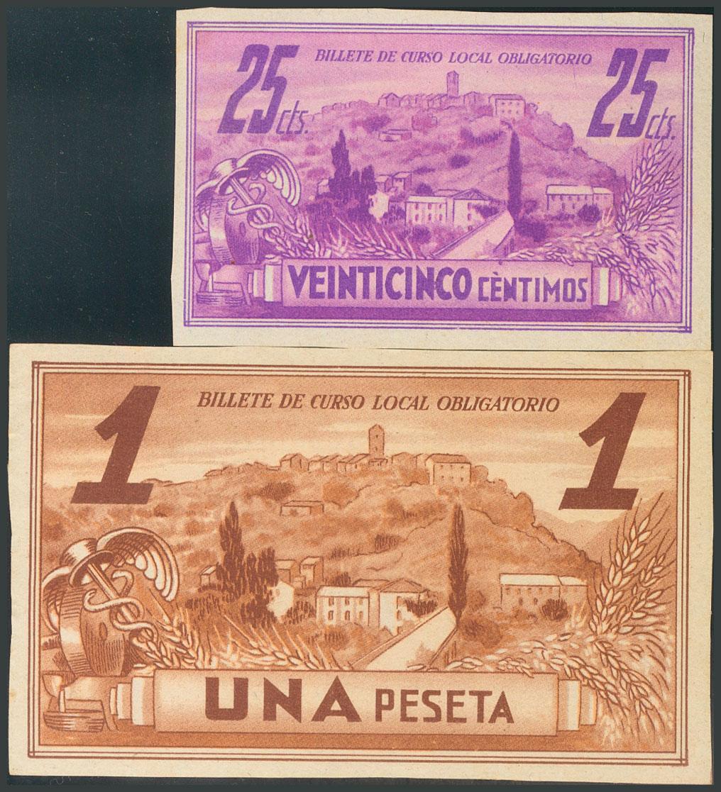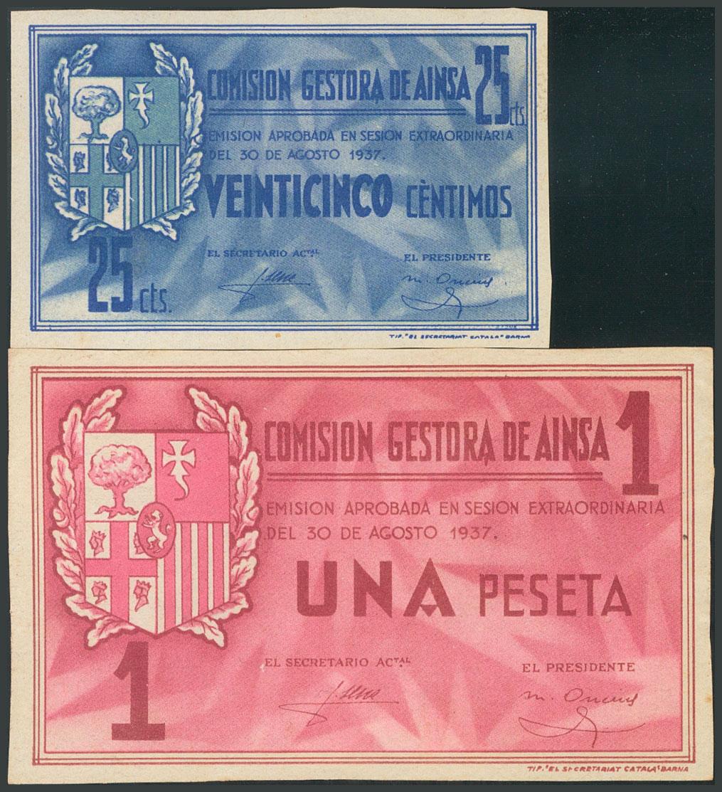 AINSA (HUESCA). 25 Céntimos y 1 Peseta. 30 de Agosto de 1937. Sin numeración. (González: 105, 107). Inusuales. SC/SC-.