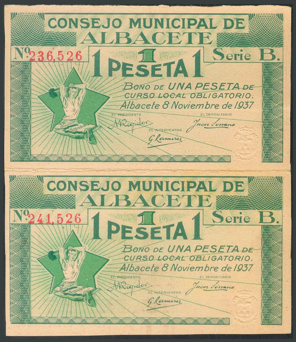 ALBACETE. 1 Peseta. 8 de Noviembre de 1937. Serie B y sin guillotinar, ambos. (González: 132). SC.