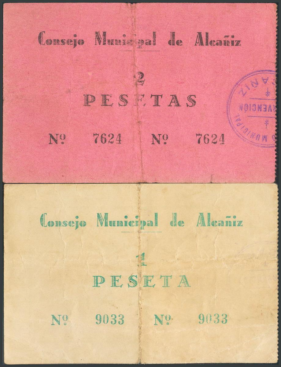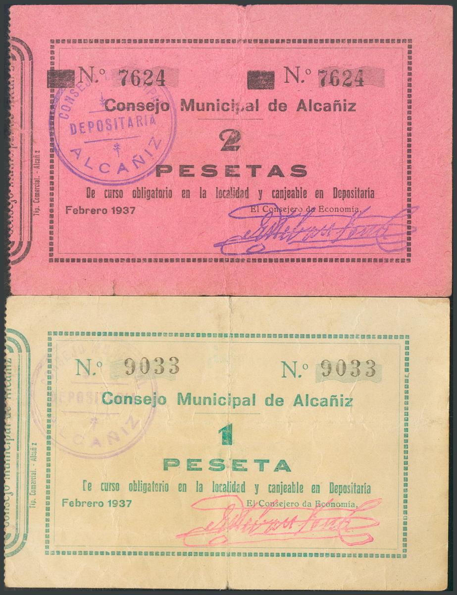 ALCAÑIZ (TERUEL). 1 Peseta y 2 Pesetas. Febrero 1937. (González: 295/96). Inusual serie completa. MBC-.