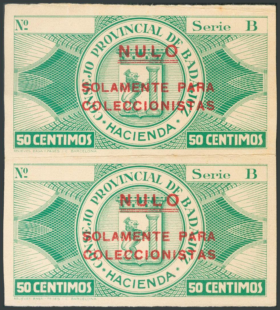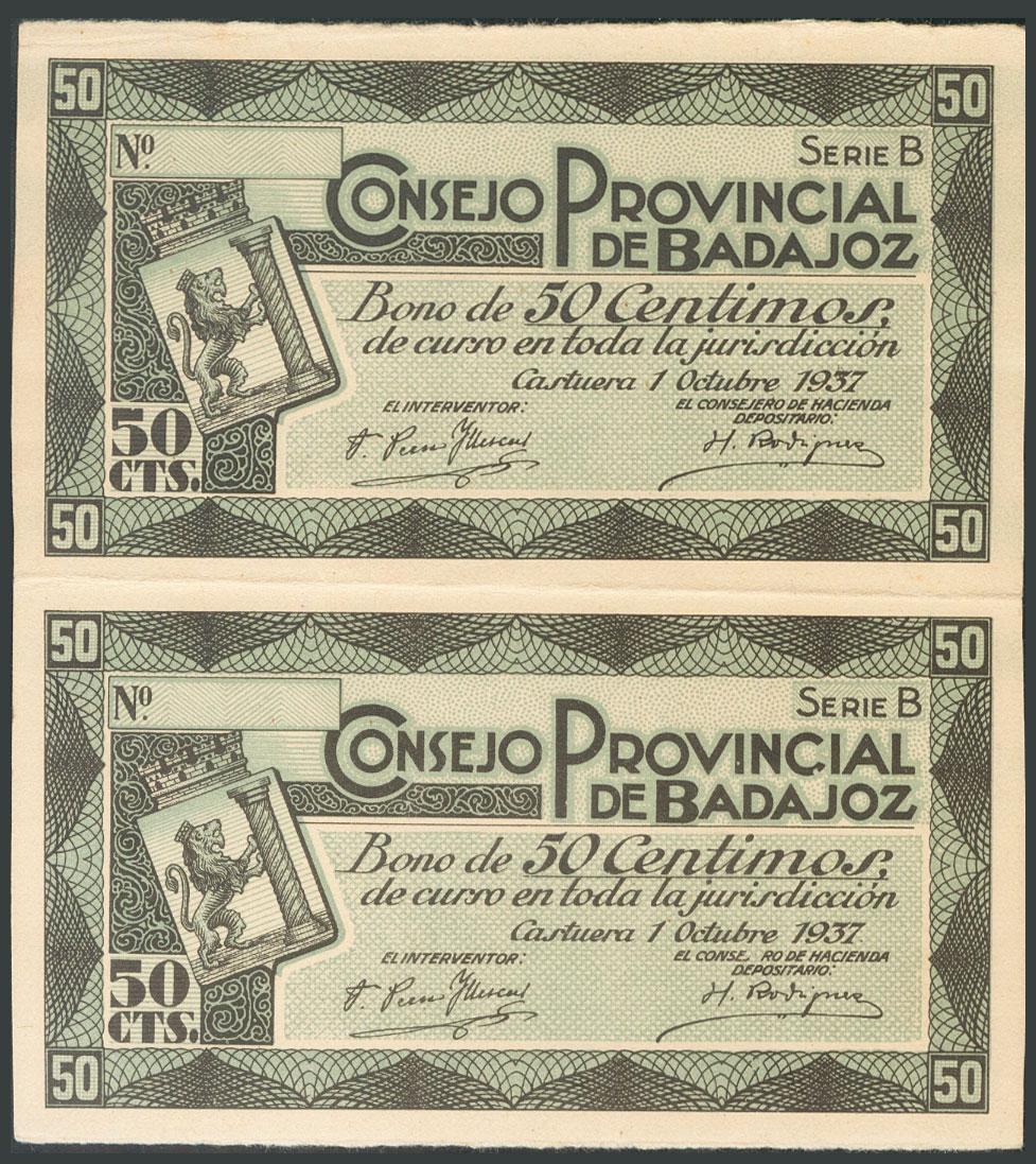 BADAJOZ. 50 Céntimos. 1 de Octubre de 1937. Serie B, ambos y sin gillotinar ni numerar, al dorso marca "Sólo para coleccionistas". (González: 835). SC.