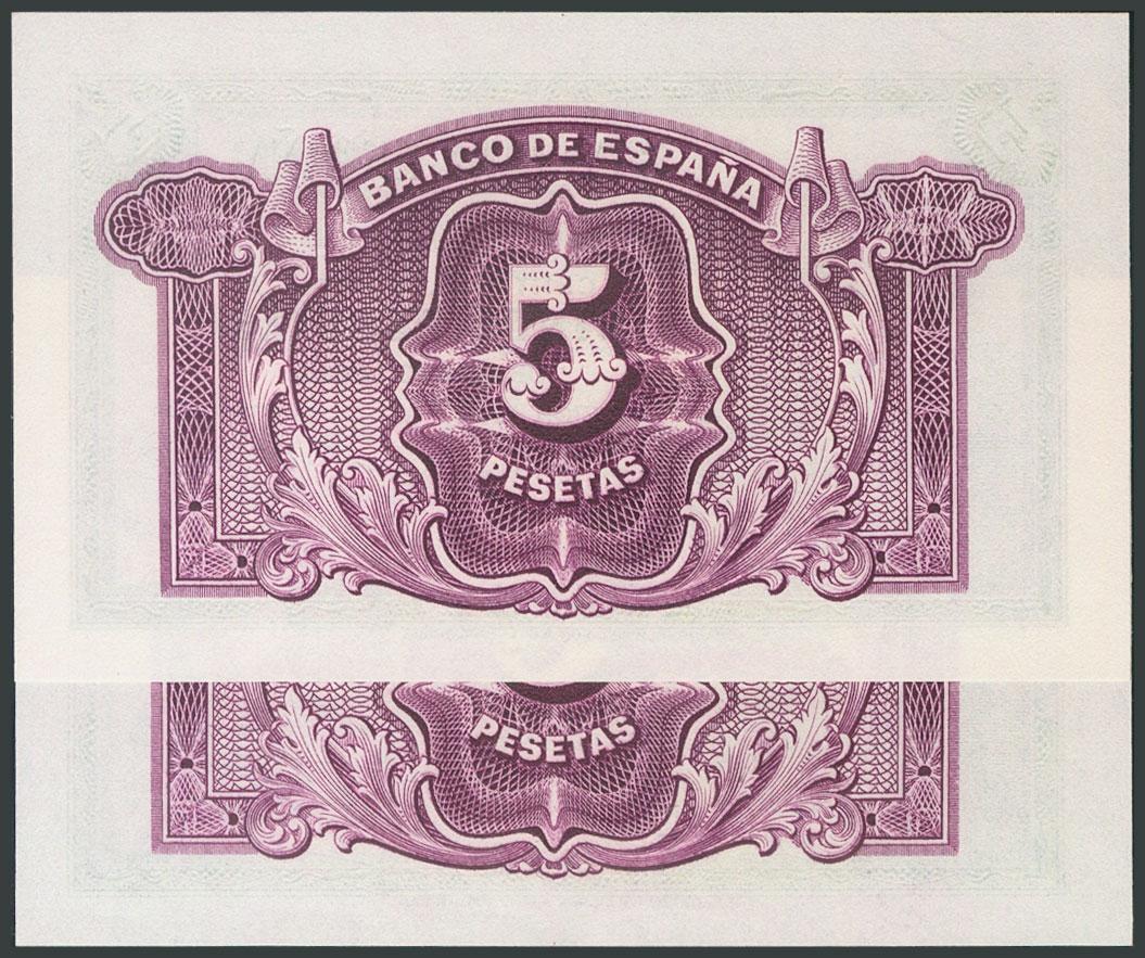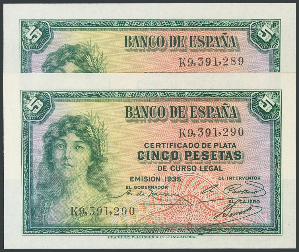 5 Pesetas. 1935. Pareja correlativa. Serie K. (Edifil 2017: 363b). Apresto original. SC.