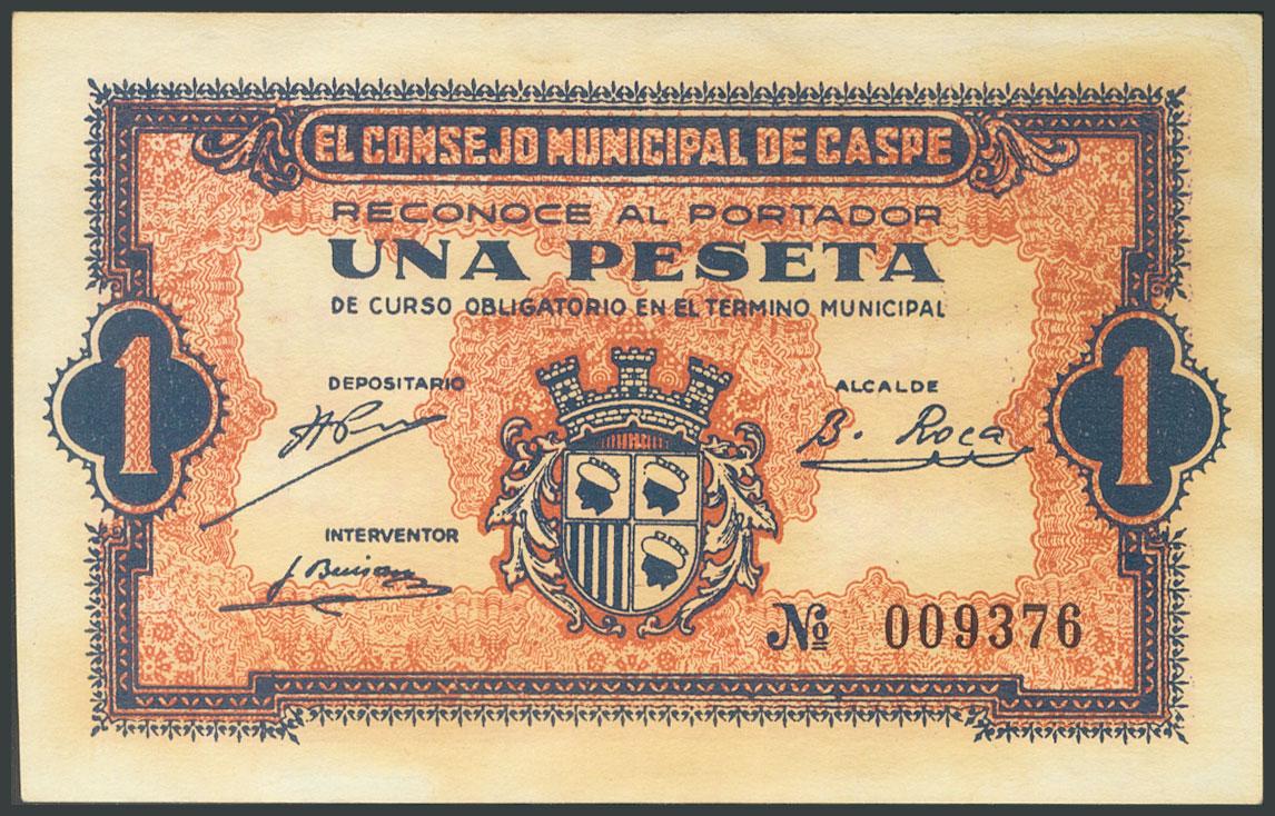 CASPE (ZARAGOZA). 1 Peseta. (1937ca). (González: 1739). EBC+.