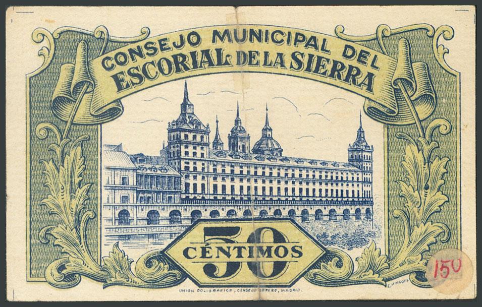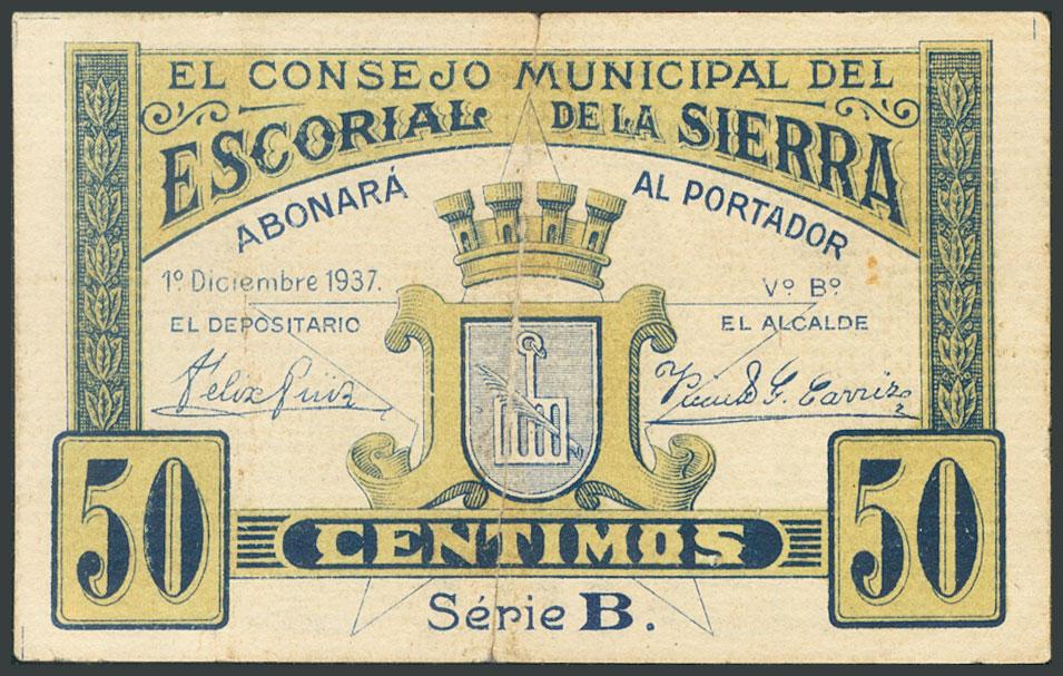 ESCORIAL DE LA SIERRA (MADRID). 50 Céntimos. 1 de Diciembre de 1937. Serie B. (González: 2325). Inusual. MBC.