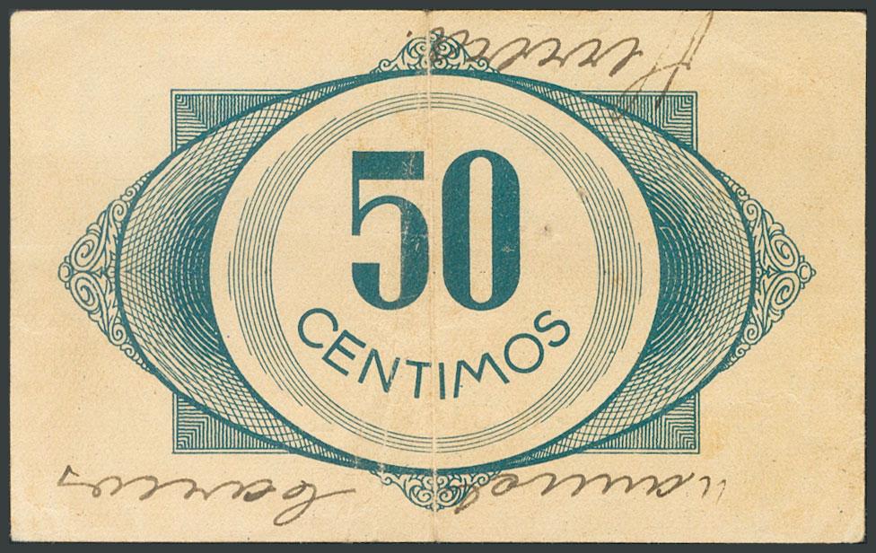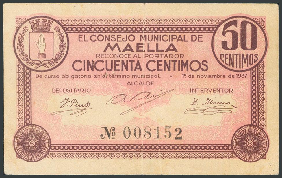 MAELLA (ZARAGOZA). 50 Céntimos. 1 de Noviembre de 1937. (González: 3312). Inusual. MBC+.