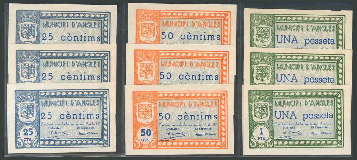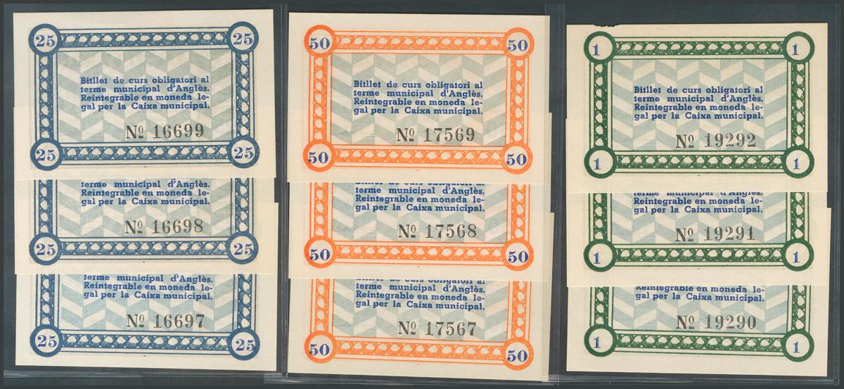 ANGLES (GERONA). 25 Céntimos, 50 Céntimos y 1 Peseta, 3 billetes de cada valor y todos ellos correlativos entre sí. (González: 6292/94). Interesantísimo conjunto. SC/SC-.