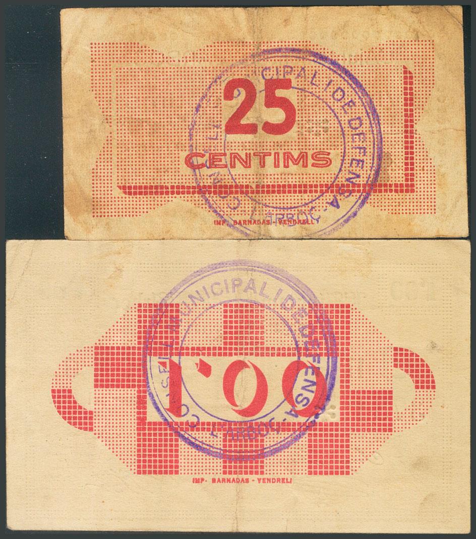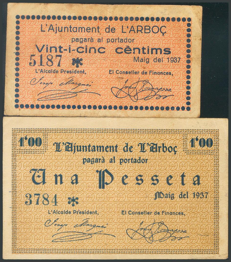 ARBOC (TARRAGONA). 25 Céntimos y 1 Peseta. Mayo 1937. (González: 6314, 6315). MBC.