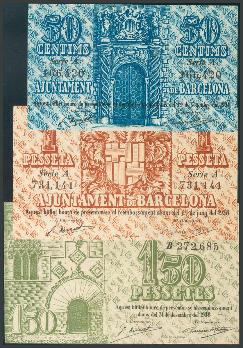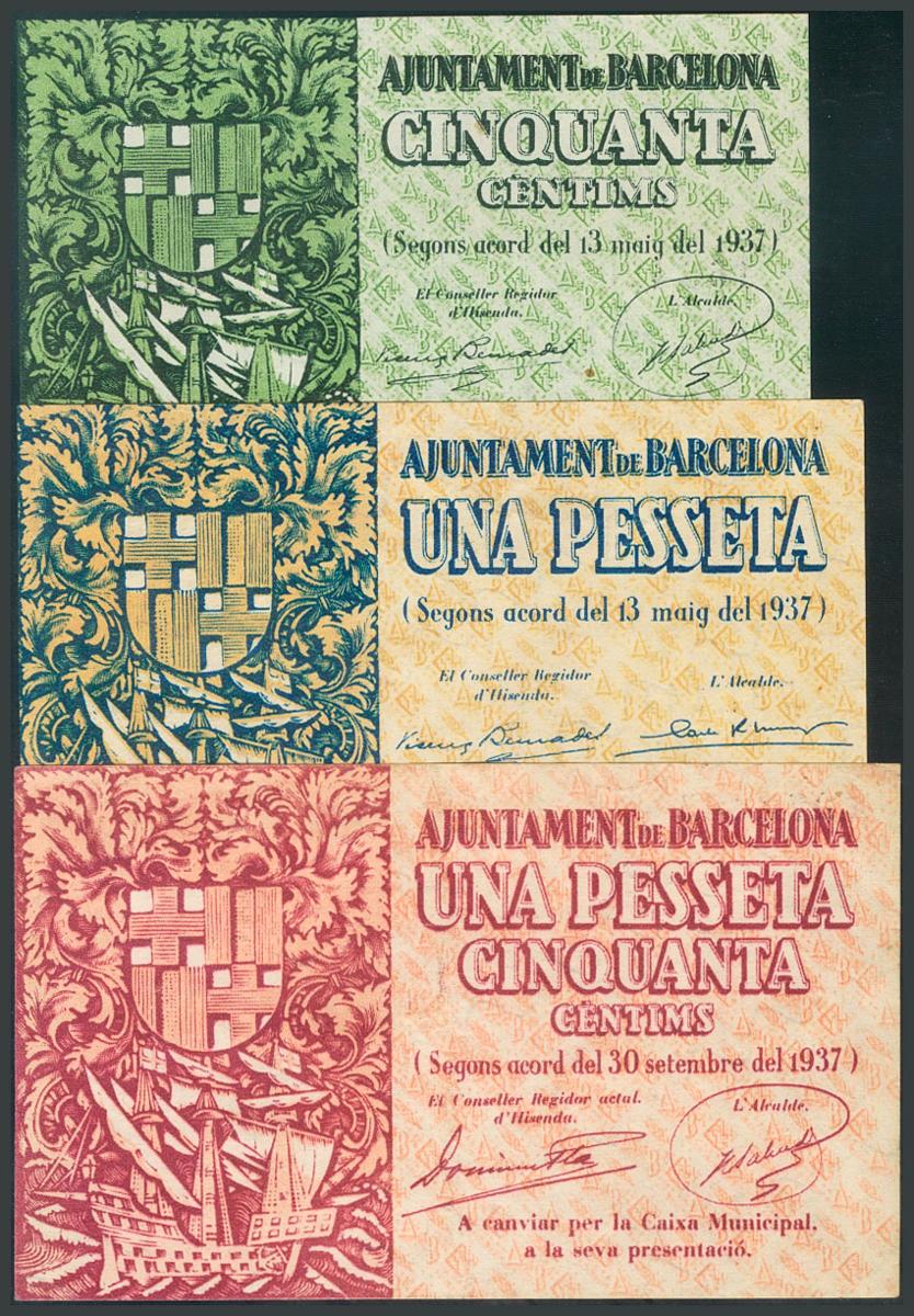 BARCELONA. 50 Céntimos, 1 Peseta y 1´50 Pesetas. 13 de Mayo de 1937 y 30 de Septiembre de 1937. Series A(2) y B, respectivamente. (González: 6520/22). EBC+.