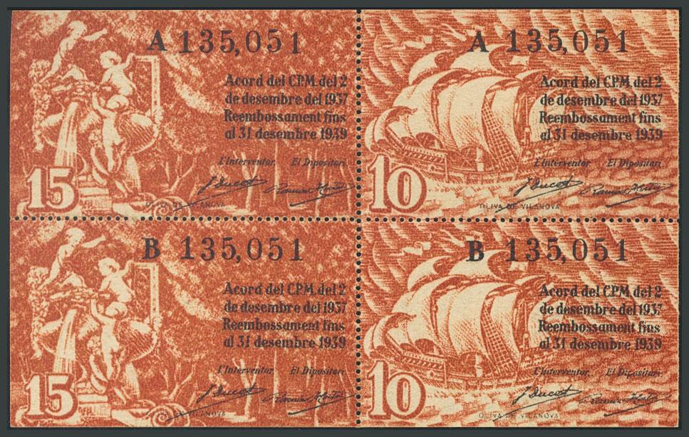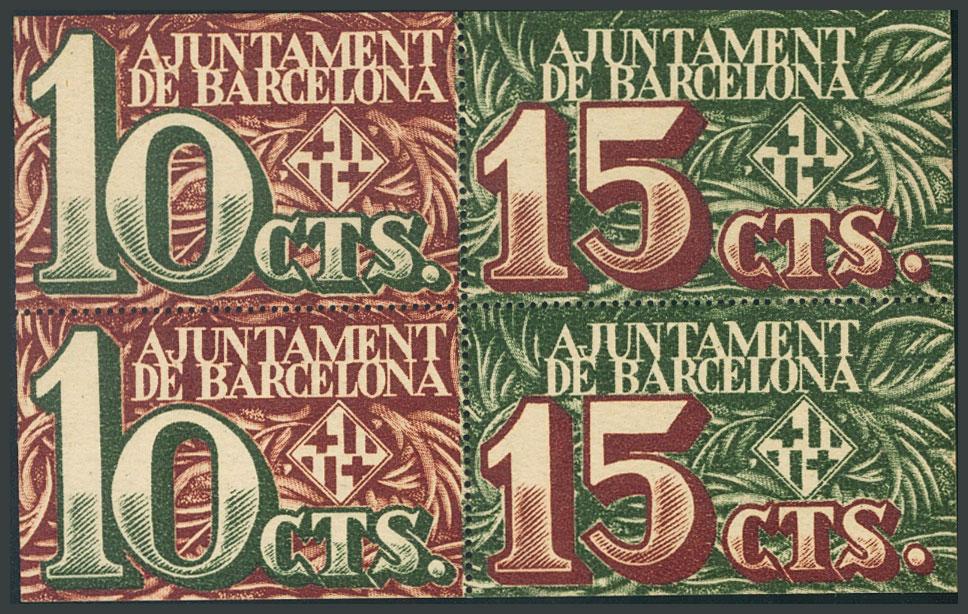 BARCELONA. 10 Céntimos (2) y 15 Céntimos (2), bloque de cuatro. 2 de Diciembre de 1937. Series A y B, respectivamente. (González: 6523/24). SC.