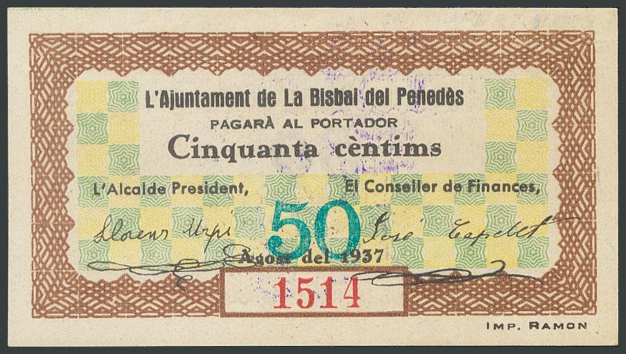 BISBAL DEL PENEDES (TARRAGONA). 50 Céntimos. Agosto 1937. (González: 7095). Inusual. SC.