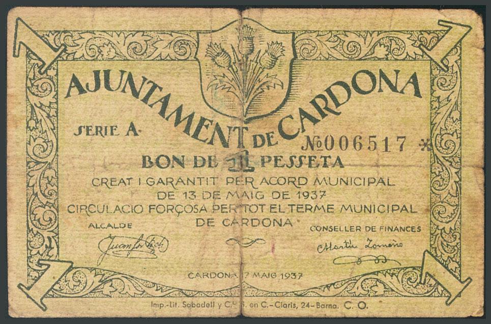 CARDONA (BARCELONA). 1 Peseta. 17 de Mayo de 1937. Serie A. (González: 7393). BC.