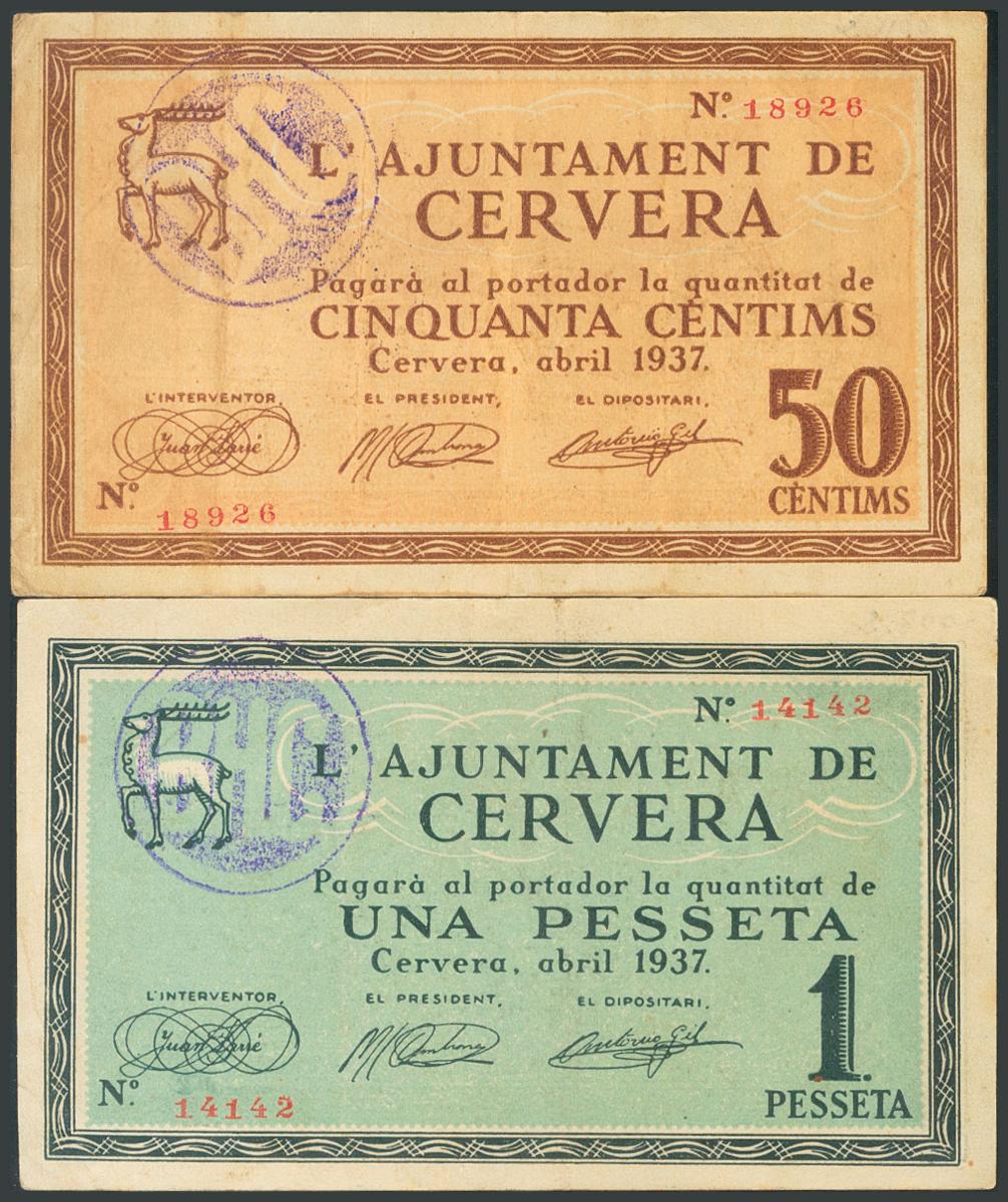 CERVERA (LERIDA). 50 Céntimos y 1 Peseta. Abril 1937. (González: 7556/57). Serie completa. MBC+.