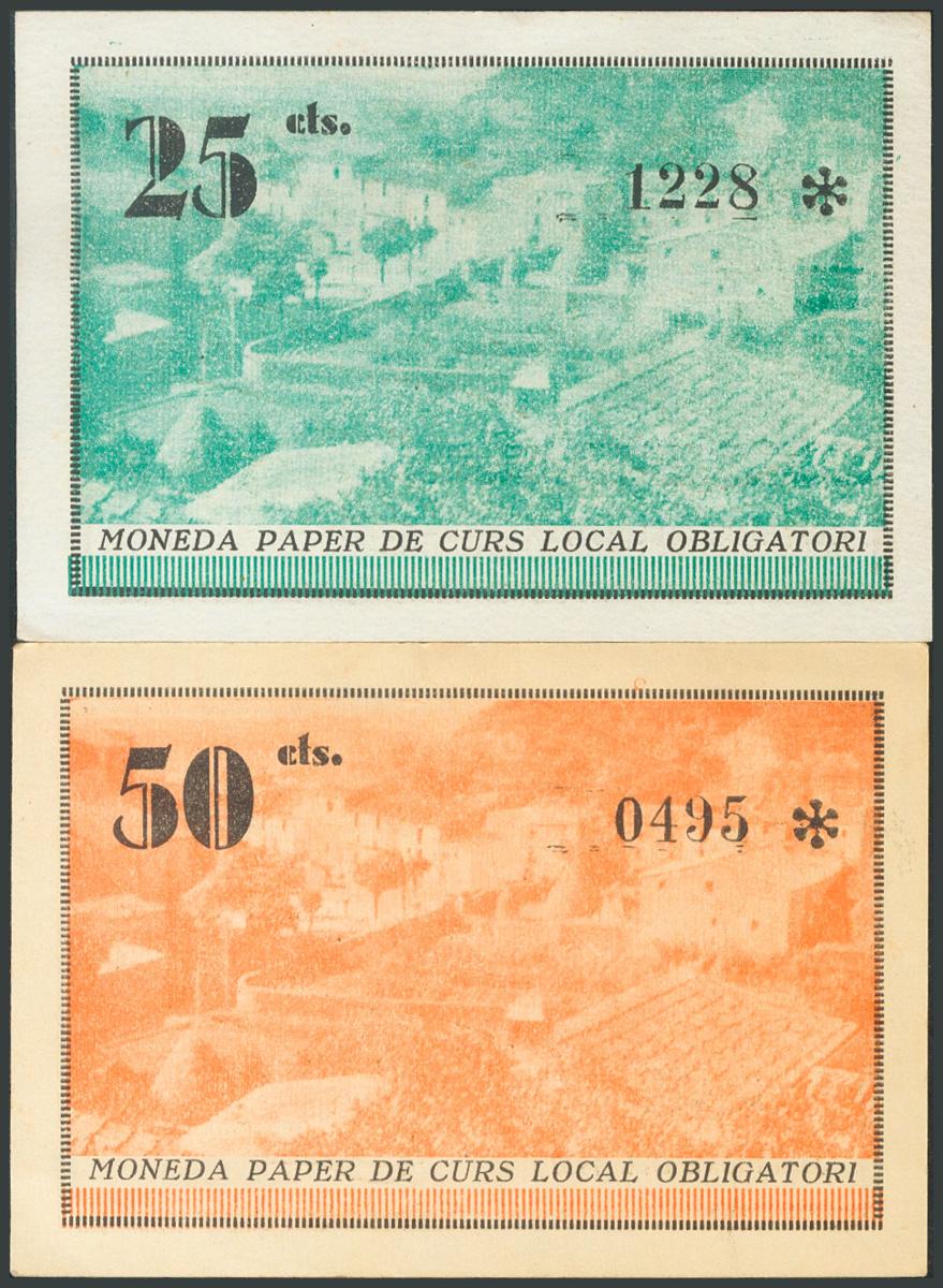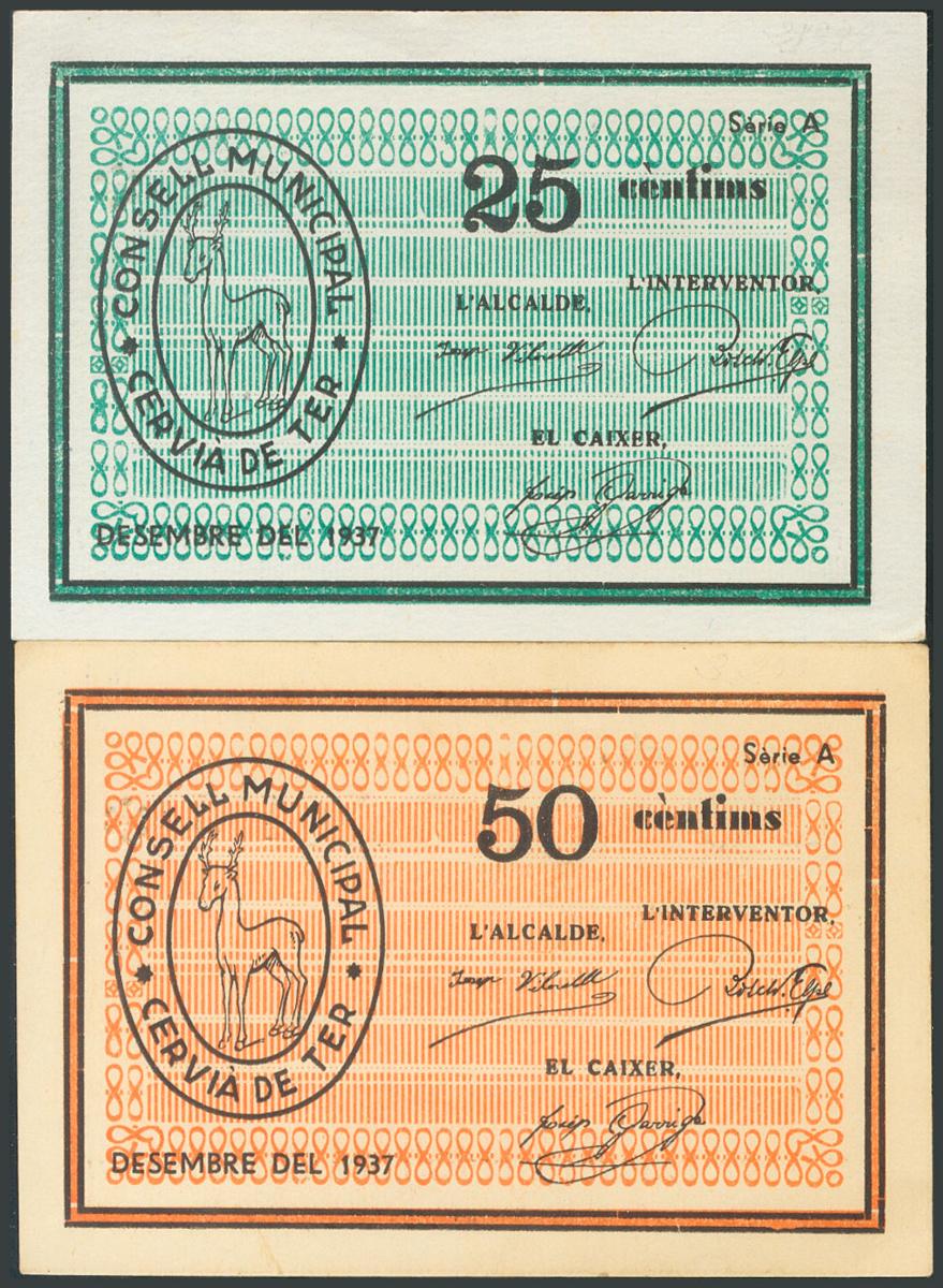 CERVIA DE TER (GERONA). 25 Céntimos y 50 Céntimos. Diciembre 1937. Serie A, ambos. (González: 7592/93). Inusual serie completa. SC-.