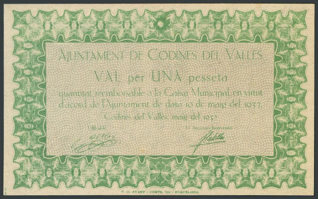 CODINES DEL VALLES (BARCELONA). 1 Peseta. 10 de Mayo de 1937. (González: 7615). SC.