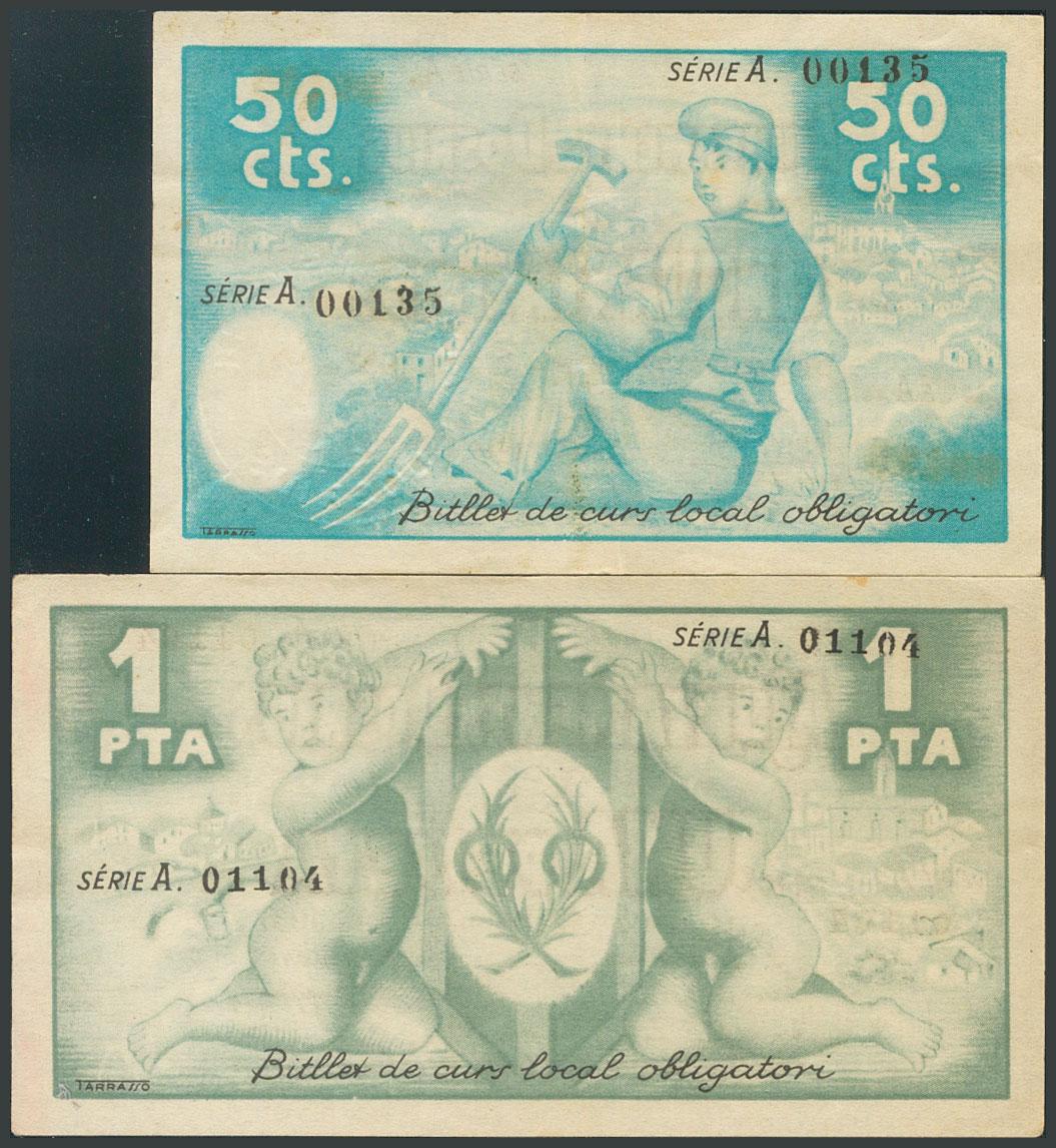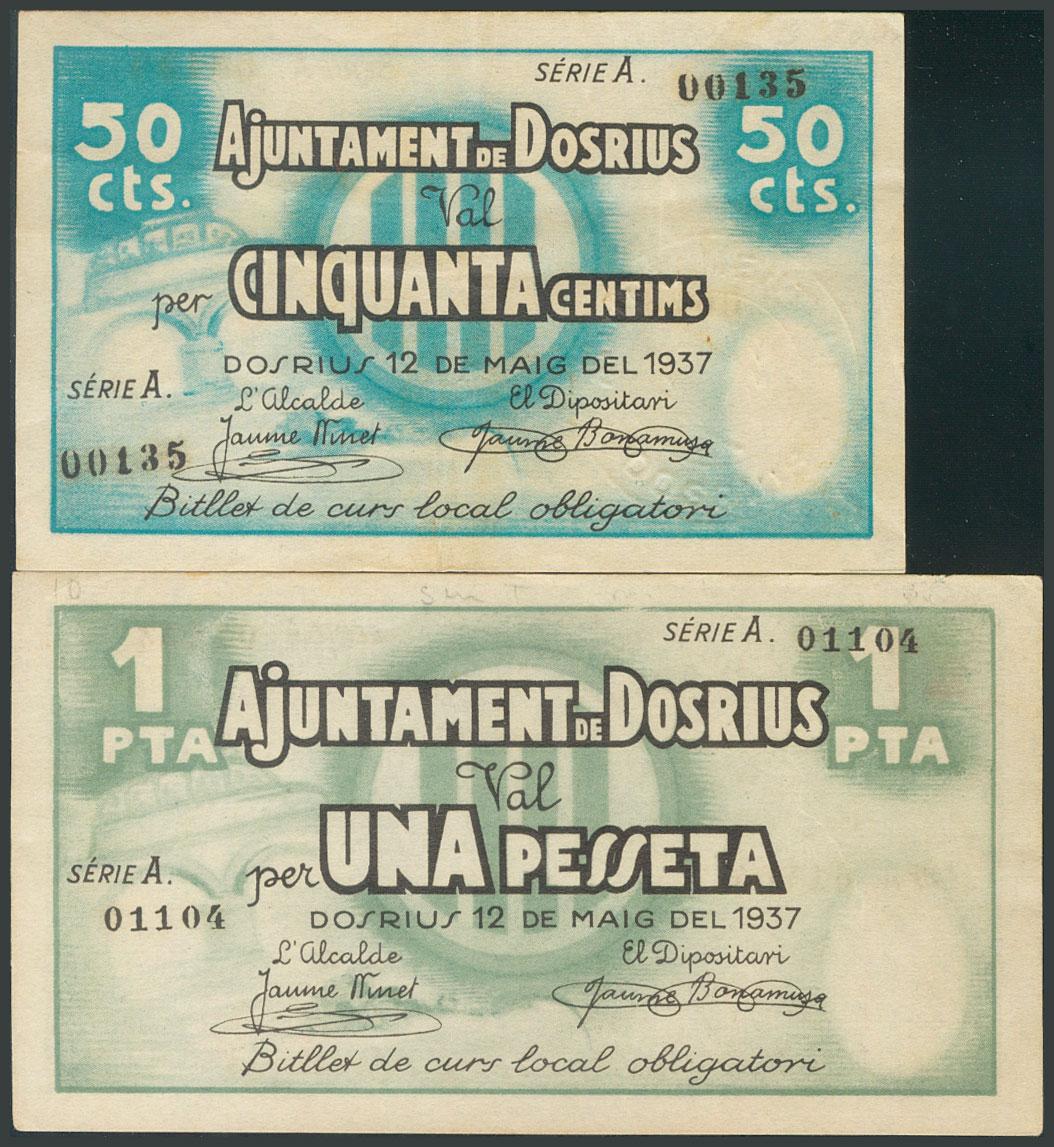 DOSRIUS (BARCELONA). 50 Céntimos y 1 Peseta. 12 de Mayo de 1937. Serie A, ambos. (González: 7721/22). Rara serie completa. MBC/EBC+.