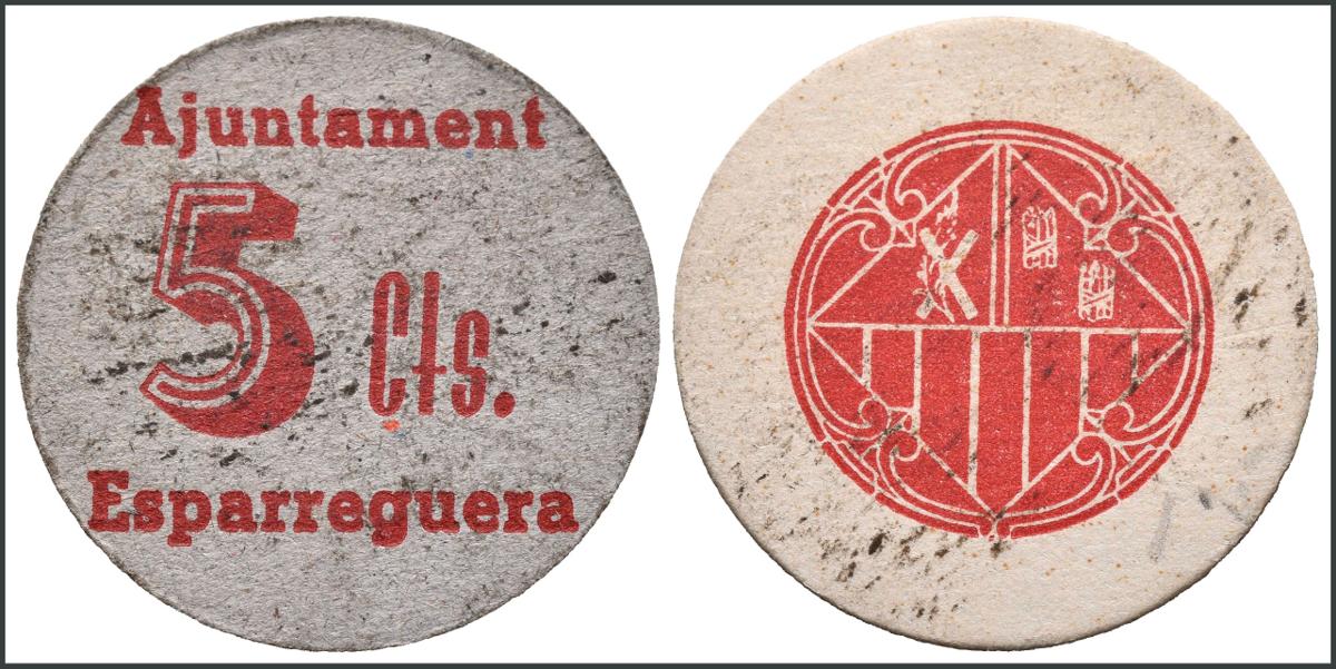 ESPARREGUERA (BARCELONA). 5 Céntimos. (1938ca). (González: 7755). Muy raro. EBC.