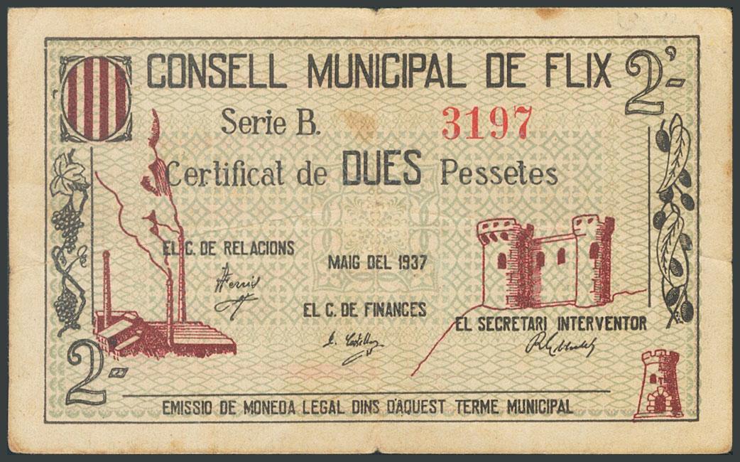 FLIX (TARRAGONA). 2 Pesetas. Mayo 1937. Serie B. (González: 7884). Raro. MBC.