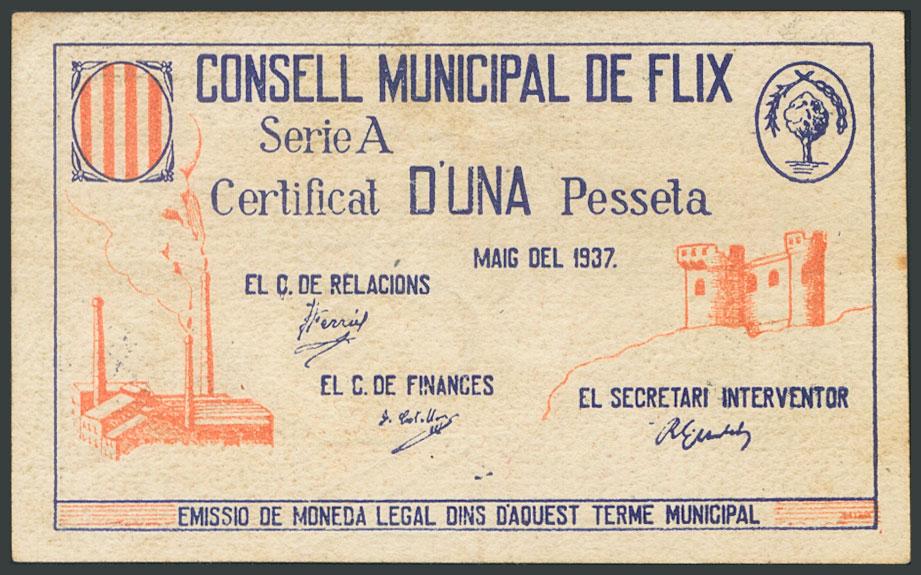 FLIX (TARRAGONA). 1 Peseta. Mayo 1937. Serie A. (González: 7885). Raro. EBC-.