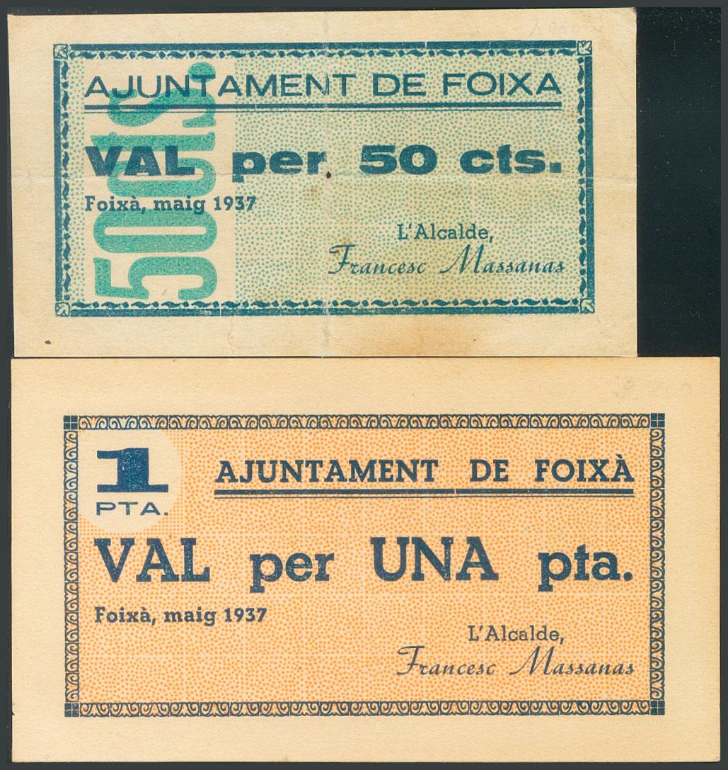 FOIXA (GERONA). 50 Céntimos y 1 Peseta. Mayo 1937. (González: 7902/03). Inusual serie completa. MBC/EBC.