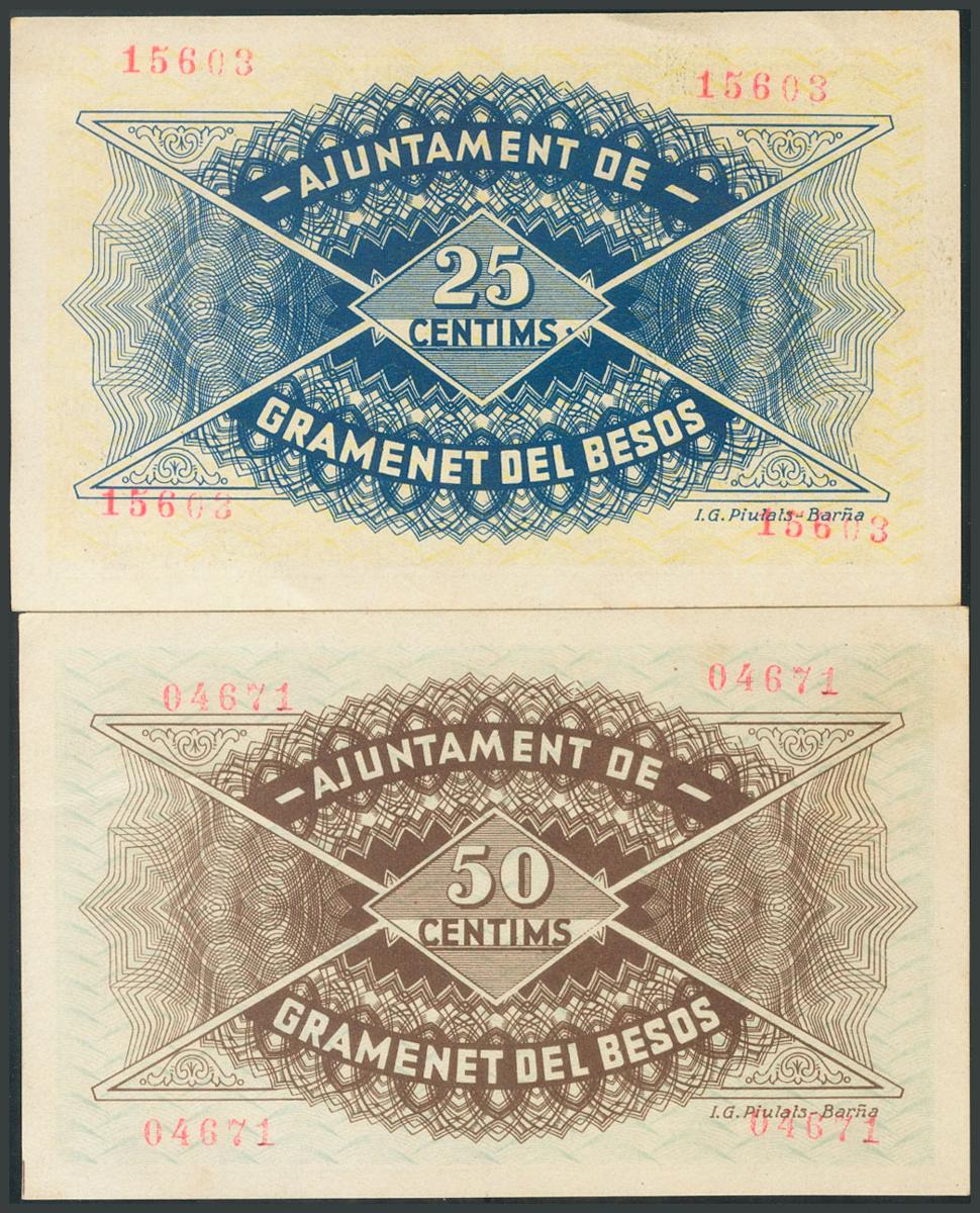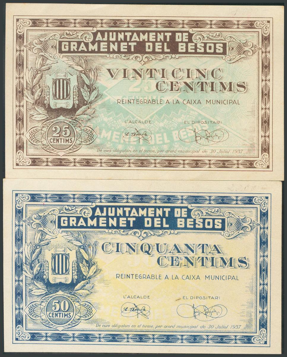 GRAMANET DEL BESOS (BARCELONA). 25 Céntimos y 50 Céntimos. 30 de Julio de 1937. (González: 8076/77). Serie completa. EBC+.