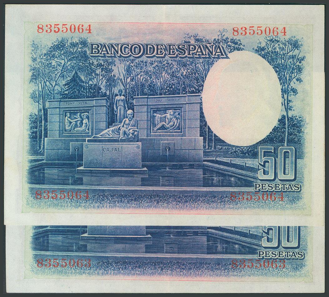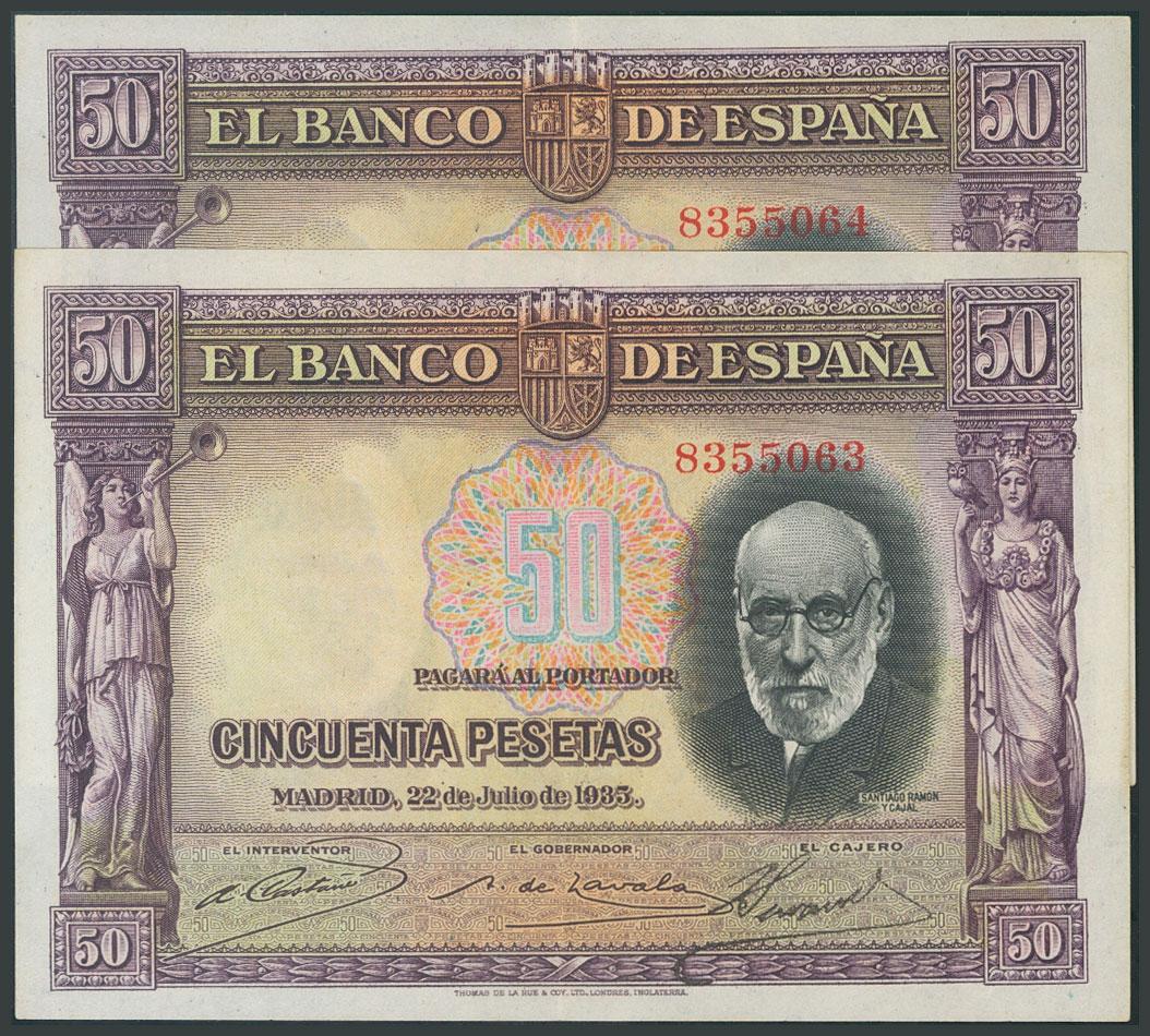 50 Pesetas. 22 de Julio de 1935. Pareja correlativa. Sin serie. (Edifil 2017: 366). Conserva gran parte de su apresto orignal. EBC.