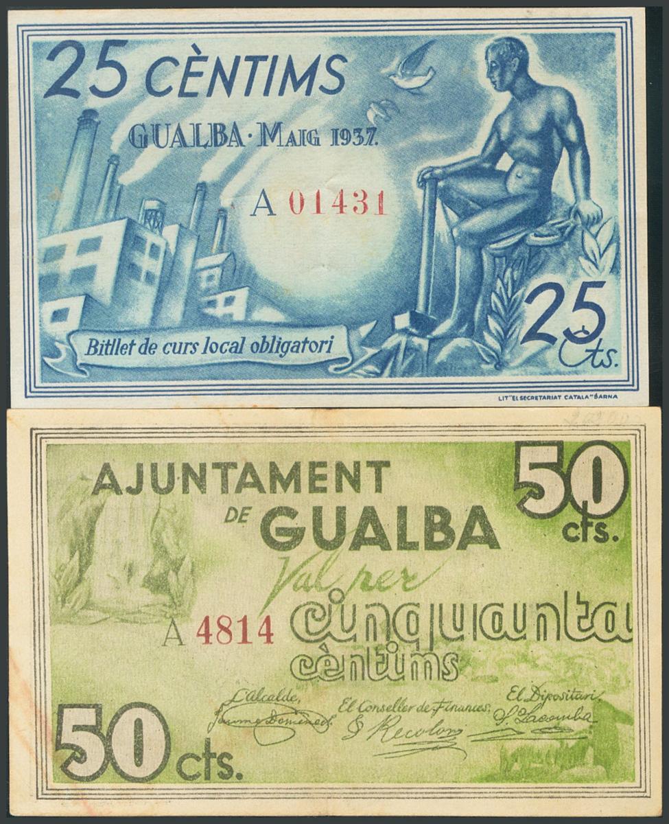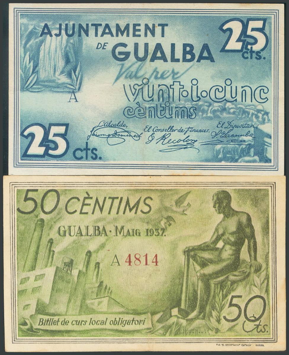 GUALBA (BARCELONA). 25 Céntimos y 50 Céntimos. Mayo 1937. Serie A, ambos. (González: 8139/40). Inusual serie completa. MBC+.