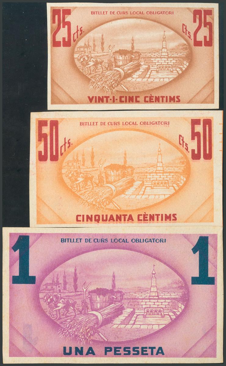 GUISSONA (LERIDA). 25 Céntimos, 50 Céntimos y 1 Peseta. 2 de Agosto de 1937. Sin numeración. (González: 8179/81). Inusual serie completa. SC/EBC+.