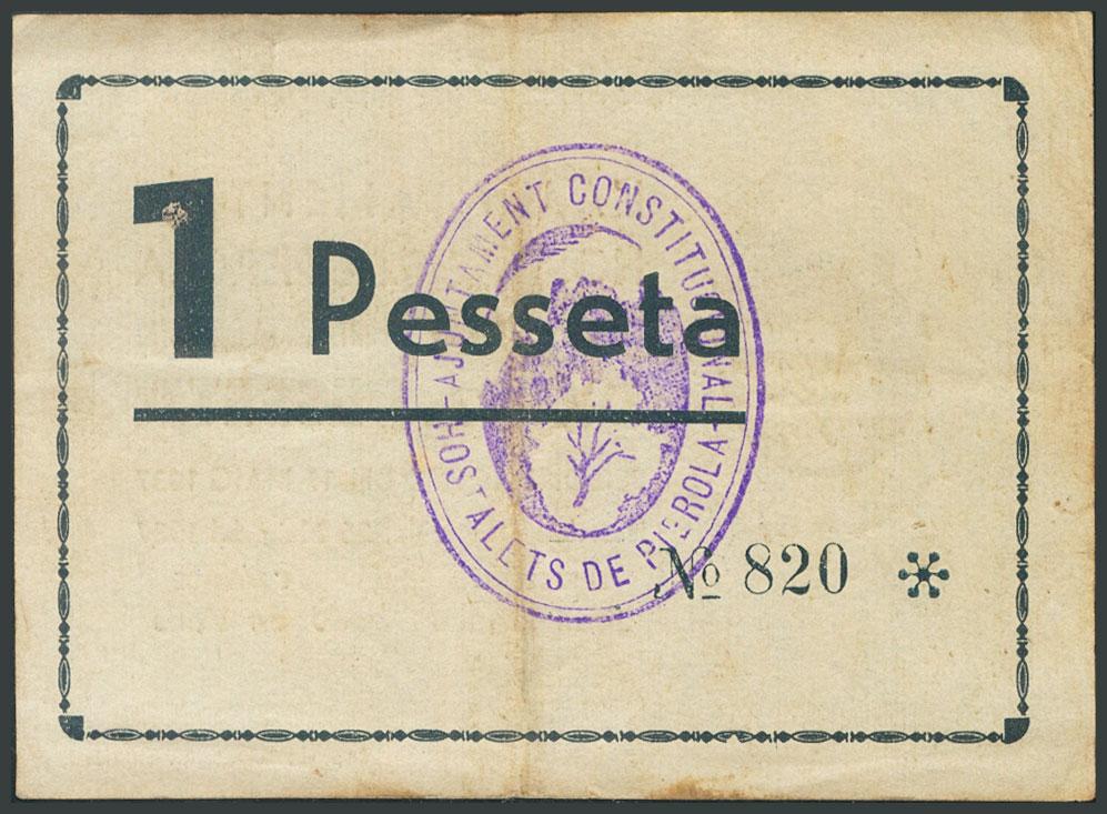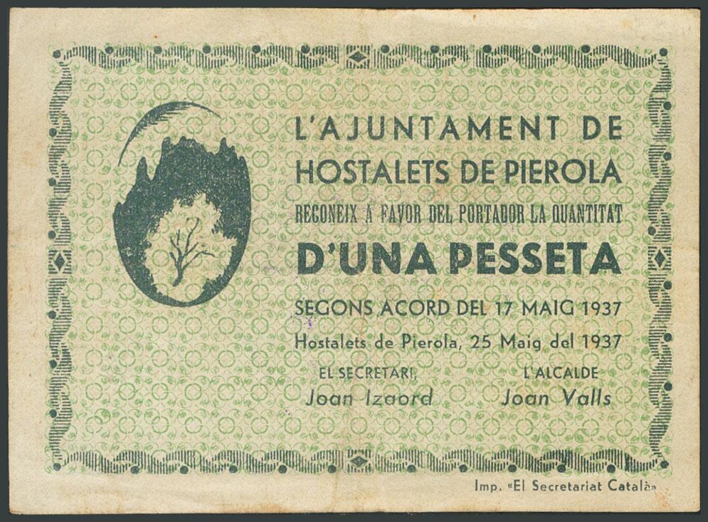 HOSTALETS DE PIEROLA (BARCELONA). 1 Peseta. Mayo 1937. (González: 8230). Inusual. MBC.