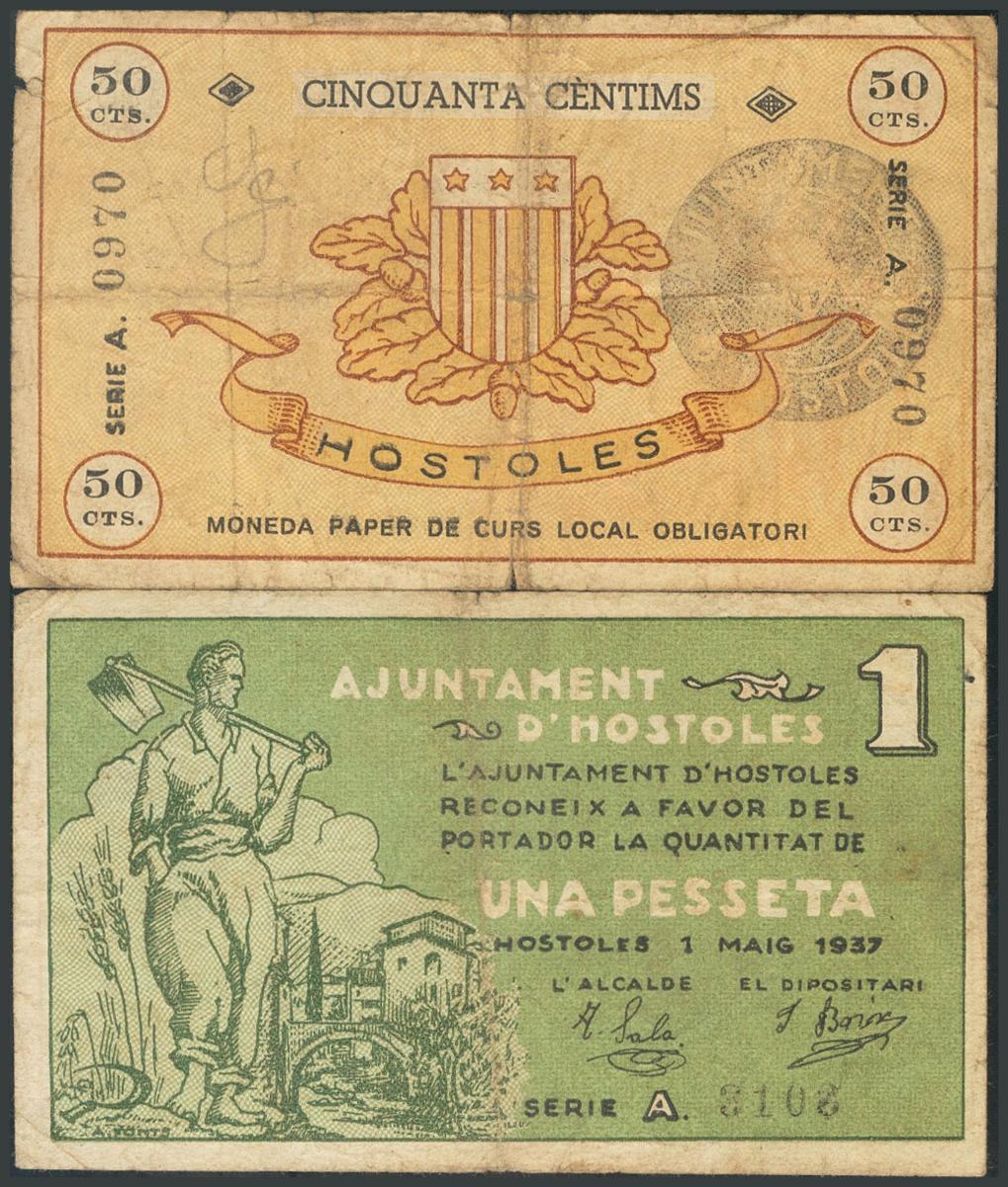 HOSTOLES (GERONA). 50 Céntimos y 1 Peseta. 1 de Mayo de 1937. Serie A, ambos. (González: 8234/35). Inusuales. RC.