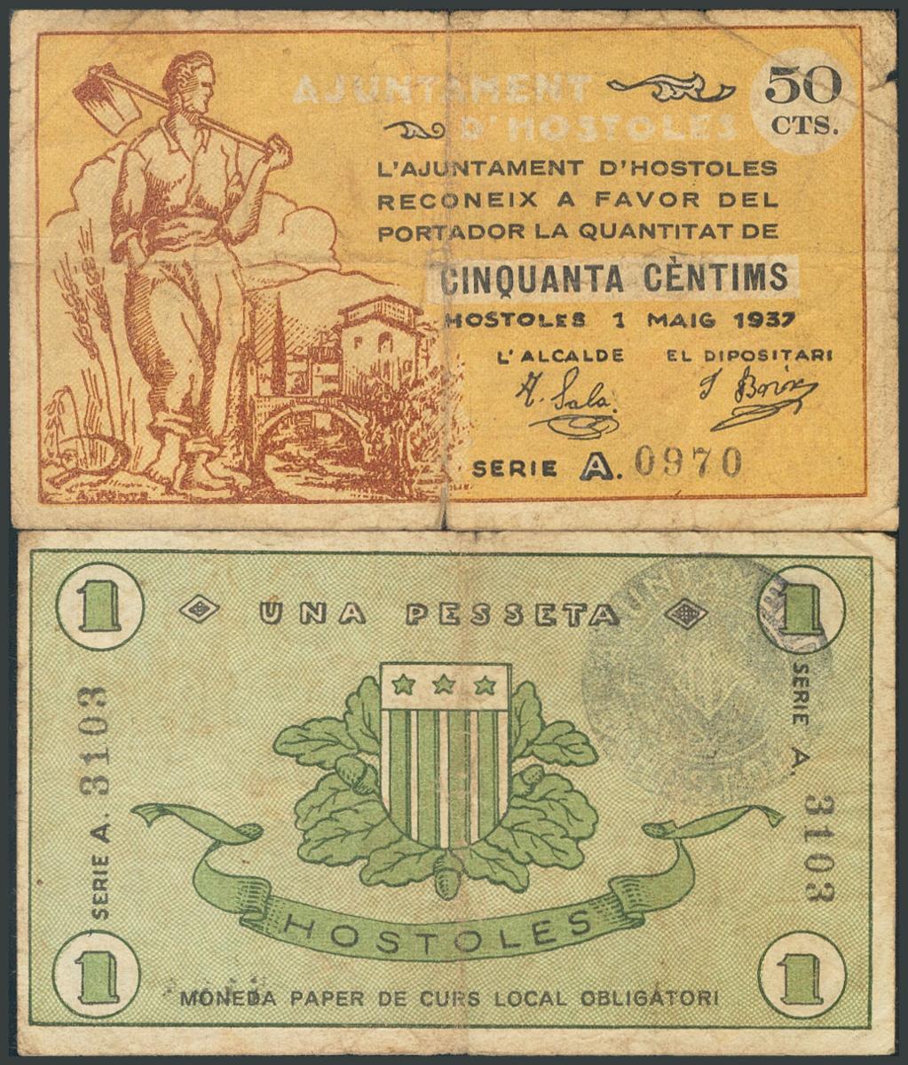 HOSTOLES (GERONA). 50 Céntimos y 1 Peseta. 1 de Mayo de 1937. Serie A, ambos. (González: 8234/35). Inusuales. RC.