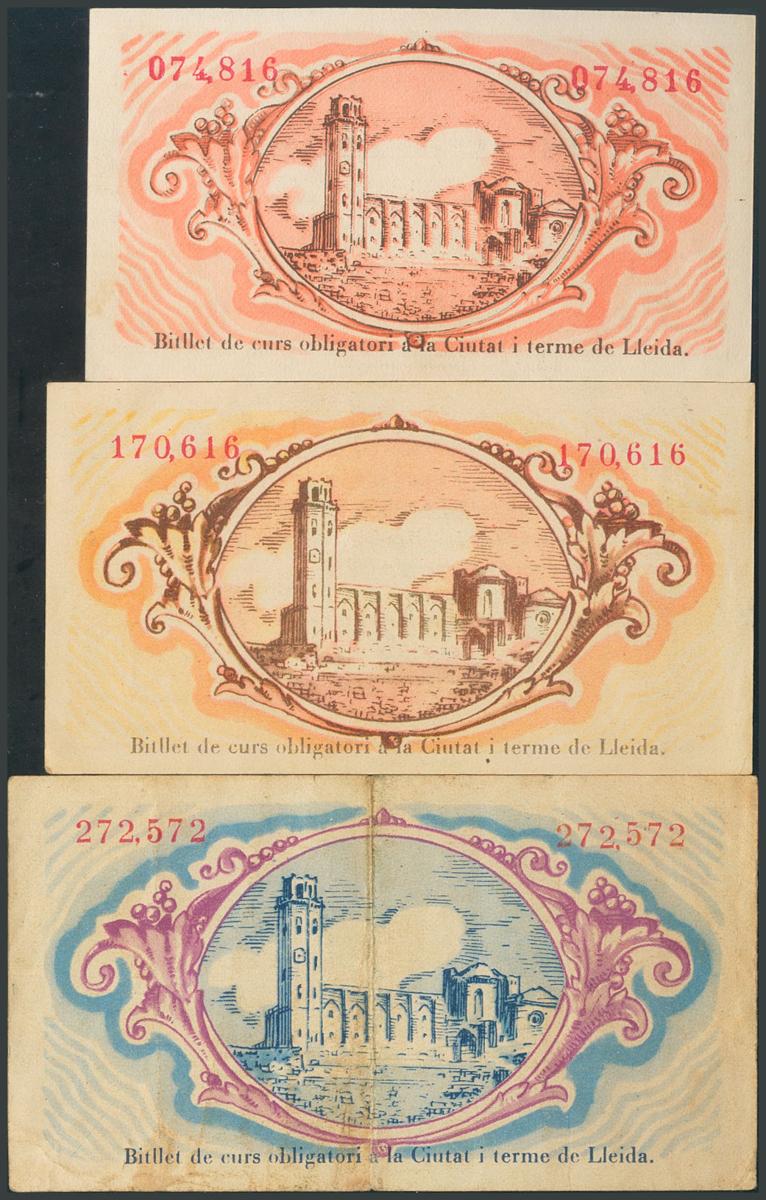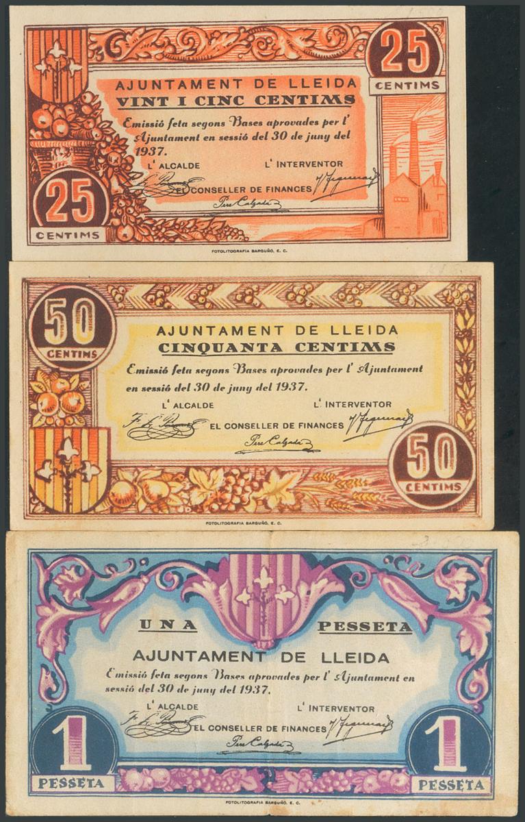 LERIDA. 25 Céntimos, 50 Céntimos y 1 Peseta. 30 de Junio de 1937. (González: 8358/60). Inusual serie completa. EBC+/MBC.