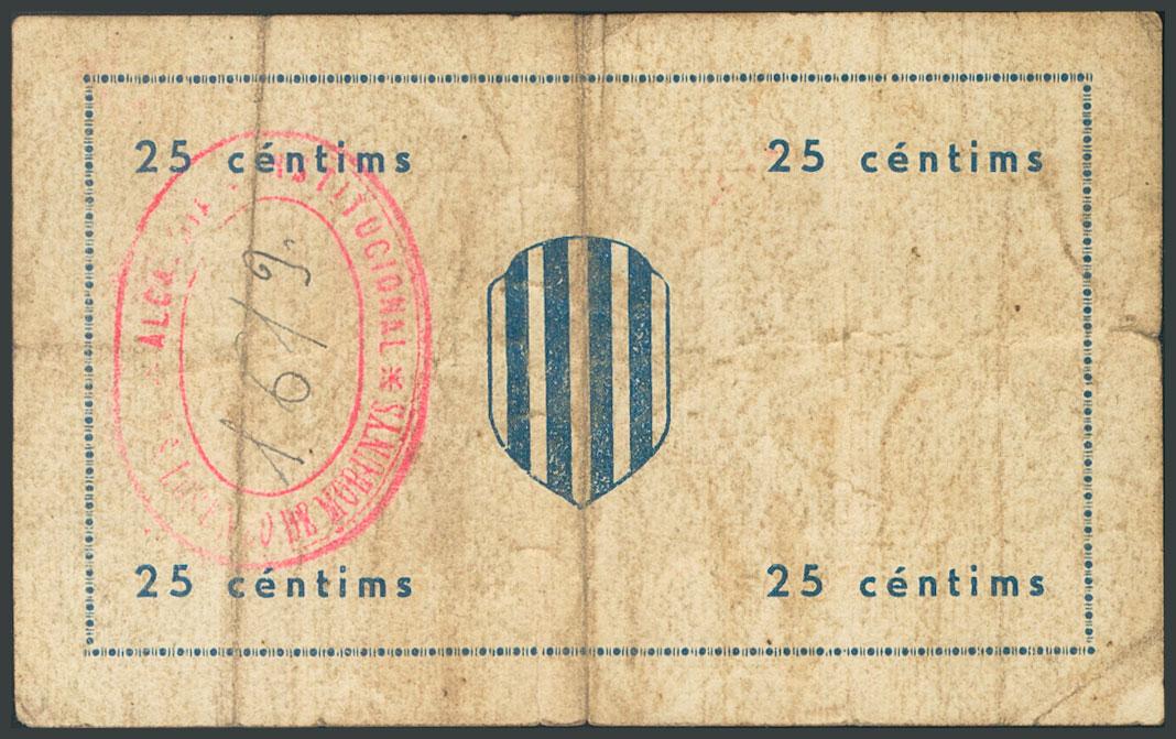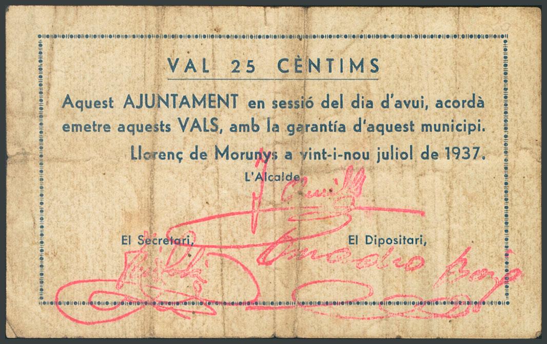 LLORENS DE MORUNYS (LERIDA). 25 Céntimos. 29 de Julio de 1937. (González: 8426). Raro. BC+.