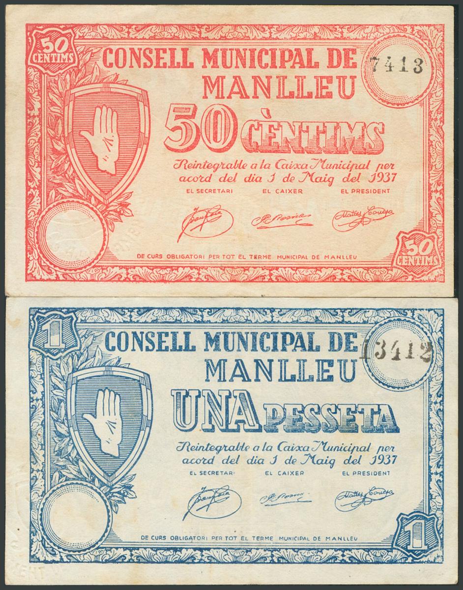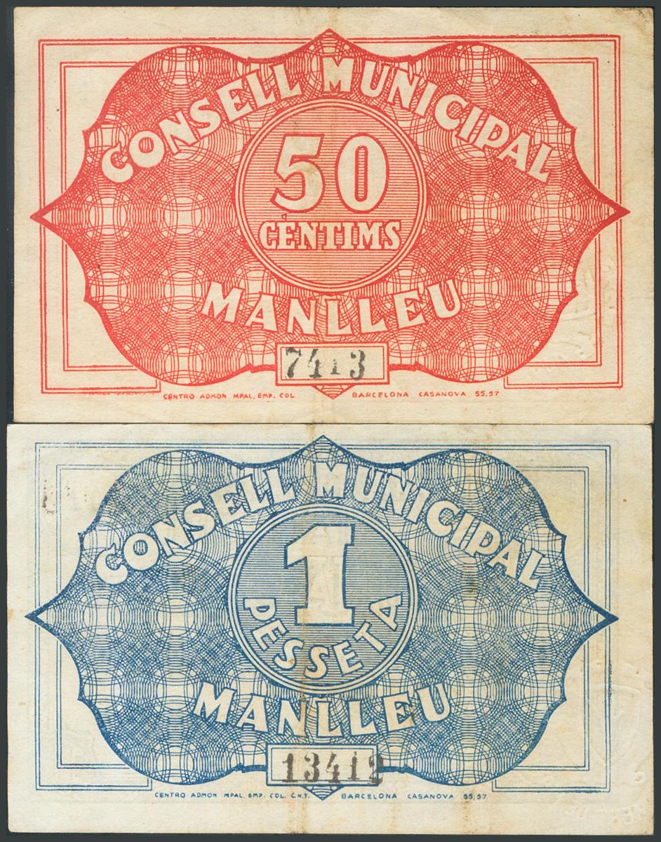 MANLLEU (BARCELONA). 50 Céntimos y 1 Peseta. 1 de Mayo de 1937. (González: 8489/90). Inusual serie completa. MBC+.