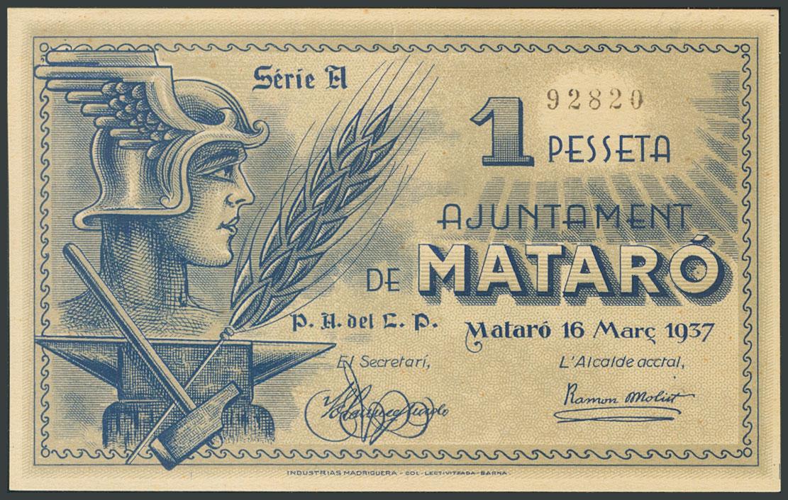MATARO (BARCELONA). 1 Peseta. 16 de Marzo de 1937. Serie A. (González: 8659). EBC.