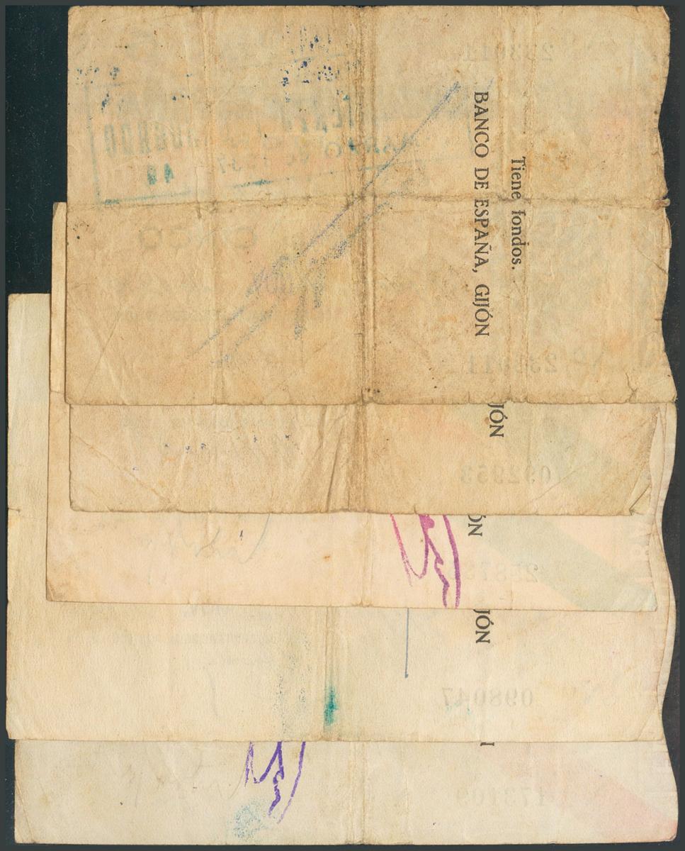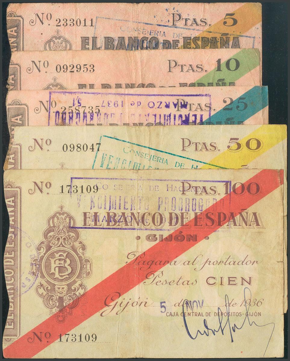 Serie completa del Banco de España, surcursal de Gijón emitida el 5 de Noviembre de 1936, que incluye los billetes de 5 Pesetas, 10 Pesetas, 25 Pesetas, 50 Pesetas y 100 Pesetas. (Edifil 2017: 380/84). BC/MBC.