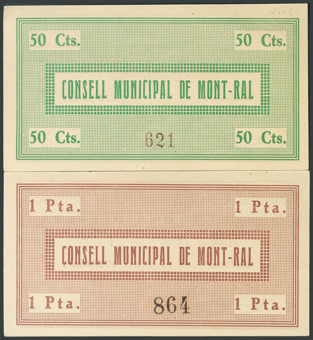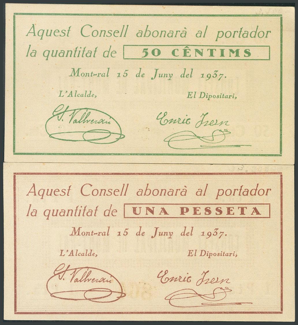 MONT-RAL (TARRAGONA). 50 Céntimos y 1 Peseta. 15 de Junio de 1937. (González: 8812, 8813). Inusuales. SC-.