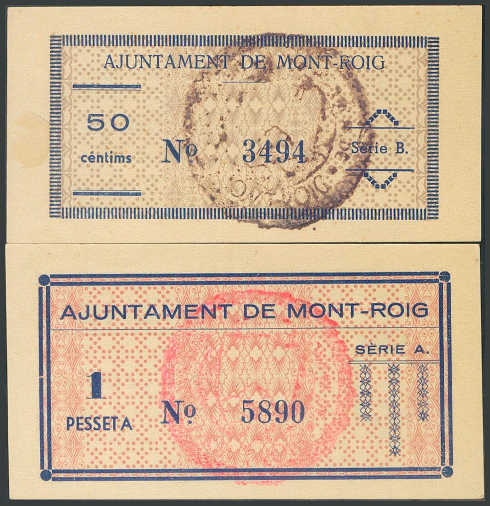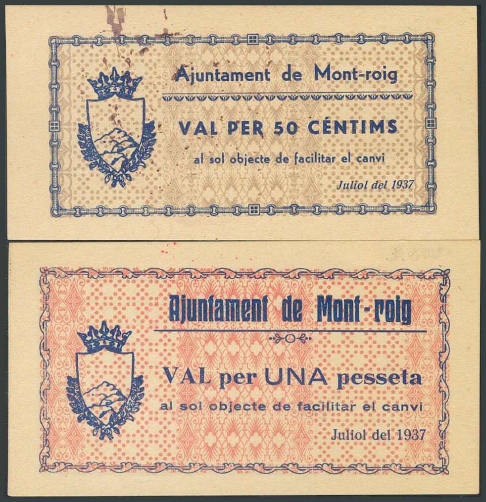 MONT-ROIG (TARRAGONA). 50 Céntimos y 1 Peseta. Julio 1937. Serie B y A, respectivamente. (González: 8819, 8820). EBC+/SC.