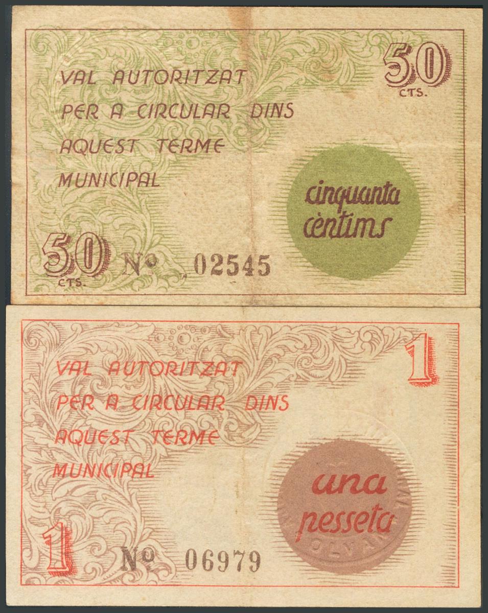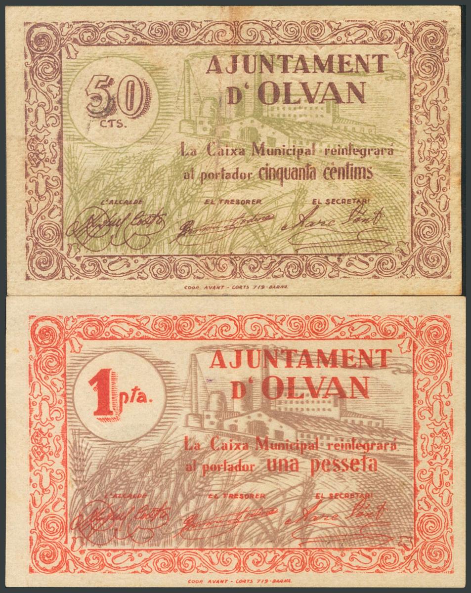 OLVAN (BARCELONA). 50 Céntimos y 1 Peseta. (1937ca). (González: 9031, 9032). MBC+/EBC.