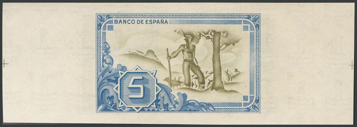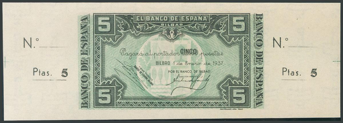 5 Pesetas. 1 de Enero de 1937. Sucursal de Bilbao, antefirma Banco de Bilbao. Sin serie y sin numeración, con ambas matrices. (Edifil 2017: 385c). SC.