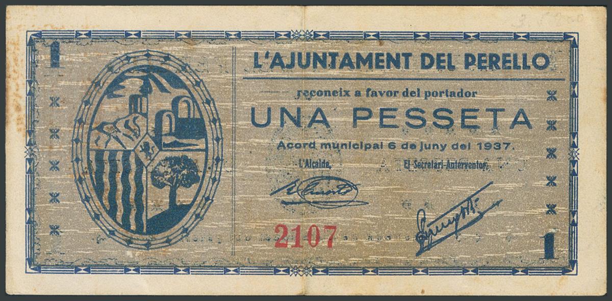 PERELLO (TARRAGONA). 1 Peseta. 6 de Junio de 1937. (González: 9204). Raro. MBC.