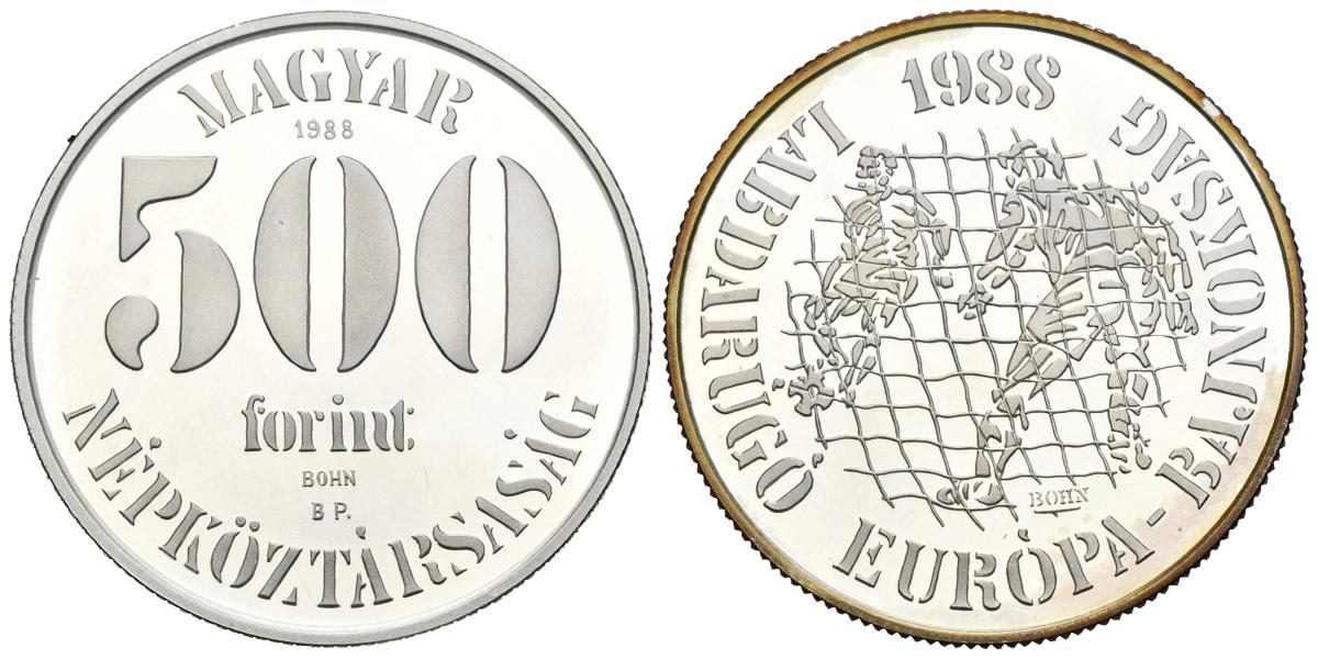 HUNGRIA. 500 Forint (Ar. 28,01g/40mm). 1988.Campeonato Europeo de Fútbol 1988. (Km#666). PROOF. Incluye capsula y estuche.
